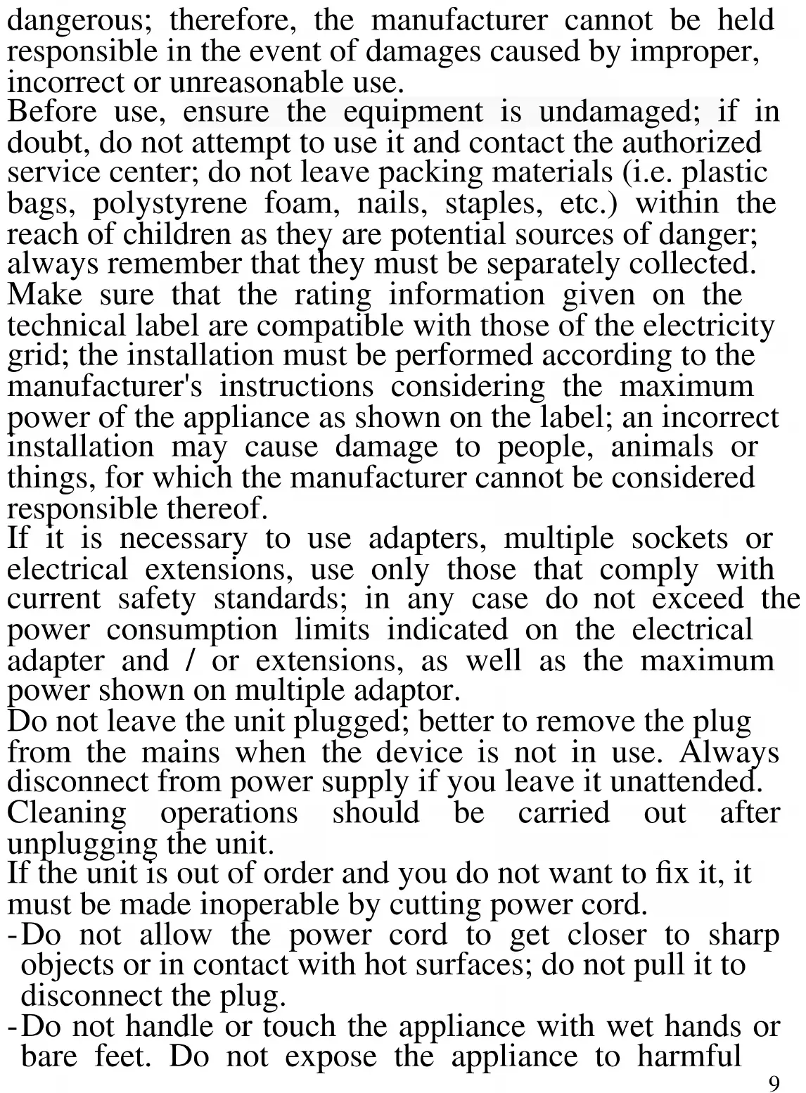 The following are important notes on the installation, use and maintenance; save this instruction manual for future reference; use the equipment only as specified in this guide; any other use is considered improper and9 dangerous; therefore, the manufacturer cannot be held responsible in the event of damages caused by improper, incorrect or unreasonable use. Before use, ensure the equipment is undamaged; if in doubt, do not attempt to use it and contact the authorized service center; do not leave packing materials (i.e. plastic bags, polystyrene foam, nails, staples, etc.) within the reach of children as they are potential sources of danger; always remember that they must be separately collected. Make sure that the rating information given on the technical label are compatible with those of the electricity grid; the installation must be performed according to the manufacturer's instructions considering the maximum power of the appliance as shown on the label; an incorrect installation may cause damage to people, animals or things, for which the manufacturer cannot be considered responsible thereof. If it is necessary to use adapters, multiple sockets or electrical extensions, use only those that comply with current safety standards; in any case do not exceed the power consumption limits indicated on the electrical adapter and / or extensions, as well as the maximum power shown on multiple adaptor. Do not leave the unit plugged; better to remove the plug from the mains when the device is not in use. Always disconnect from power supply if you leave it unattended. Cleaning operations should be carried out after unplugging the unit. If the unit is out of order and you do not want to fix it, it must be made inoperable by cutting power cord. - Do not allow the power cord to get closer to sharp objects or in contact with hot surfaces; do not pull it to disconnect the plug. - Do not handle or touch the appliance with wet hands or bare feet. Do not expose the appliance to harmful10 weather conditions such as rain, moisture, frost, etc.. Always store it in a dry place. - Do not use the appliance in the event of damage to the power cord, plug, or in case of short circuits; to repair the product only address an authorized service center. - This appliance can be used by children of 8 years and above and persons with reduced physical, sensory or mental capabilities or lack of experience and knowledge if they received supervision or instruction concerning use of the appliance in a safe way and understand hazards involved; children shall not play with the appliance; cleaning and user maintenance shall not be made by children without supervision. - Children must not play with the appliance. - Keep the appliance and its cord out of reach of children less than 8 years. If the power cord is damaged, or in case of failure and / or malfunction do not tamper with the unit. The reparation must be done by manufacturer or by service center authorized by the manufacturer in order to prevent any risk. Failure to comply with the above may compromise the unit safety and invalidate the warranty.