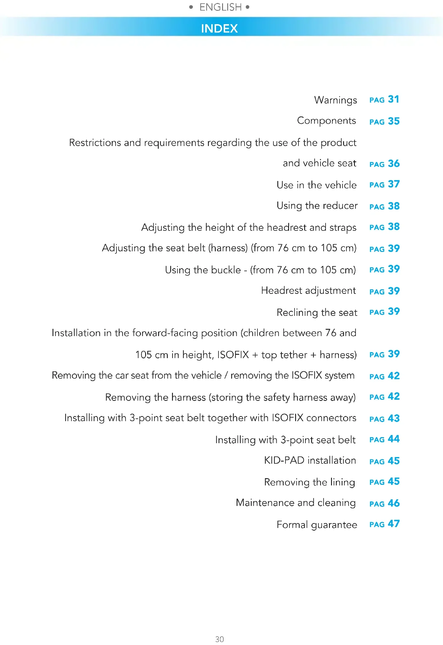INDEX WARNINGS pag 31 pag 35 pag 36 pag 37 pag 38 pag 38 pag 39 pag 39 pag 39 pag 39 pag 39 pag 42 pag 42 pag 43 pag 44 pag 45 pag 45 pag 46 pag 47 Warnings Components Restrictions and requirements regarding the use of the product and vehicle seat Use in the vehicle Using the reducer Adjusting the height of the headrest and straps Adjusting the seat belt (harness) (from 76 cm to 105 cm) Using the buckle - (from 76 cm to 105 cm) Headrest adjustment Reclining the seat Installation in the forward-facing position (children between 76 and 105 cm in height, ISOFIX + top tether + harness) Removing the car seat from the vehicle / removing the ISOFIX system Removing the harness (storing the safety harness away) Installing with 3-point seat belt together with ISOFIX connectors Installing with 3-point seat belt KID-PAD installation Removing the lining Maintenance and cleaning Formal guarantee• ENGLISH •