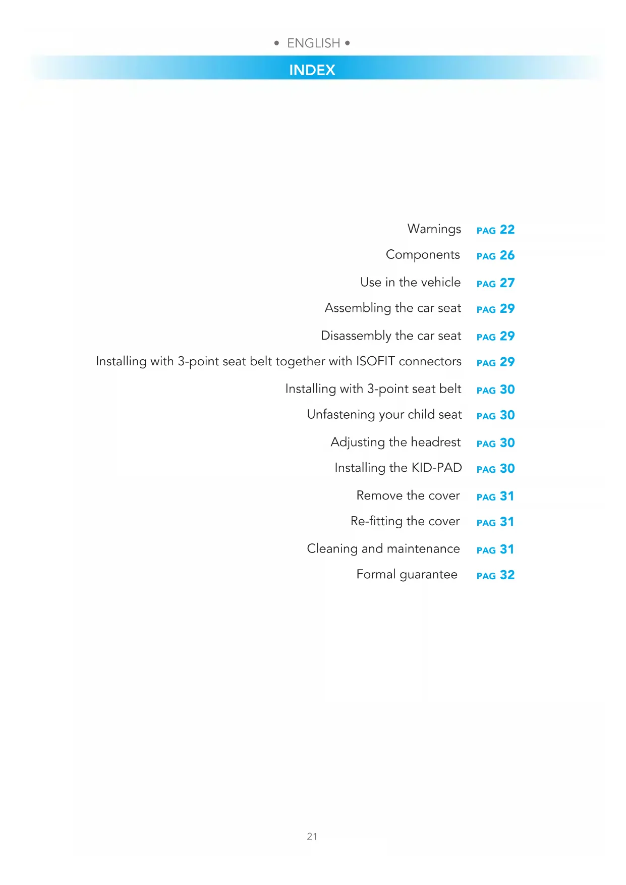 INDEX pag 22 pag 26 pag 27 pag 29 pag 29 pag 29 pag 30 pag 30 pag 30 pag 30 pag 31 pag 31 pag 31 pag 32 Warnings Components Use in the vehicle Assembling the car seat Disassembly the car seat Installing with 3-point seat belt together with ISOFIT connectors Installing with 3-point seat belt Unfastening your child seat Adjusting the headrest Installing the KID-PAD Remove the cover Re-tting the cover Cleaning and maintenance Formal guarantee• ENGLISH • • ENGLISH •