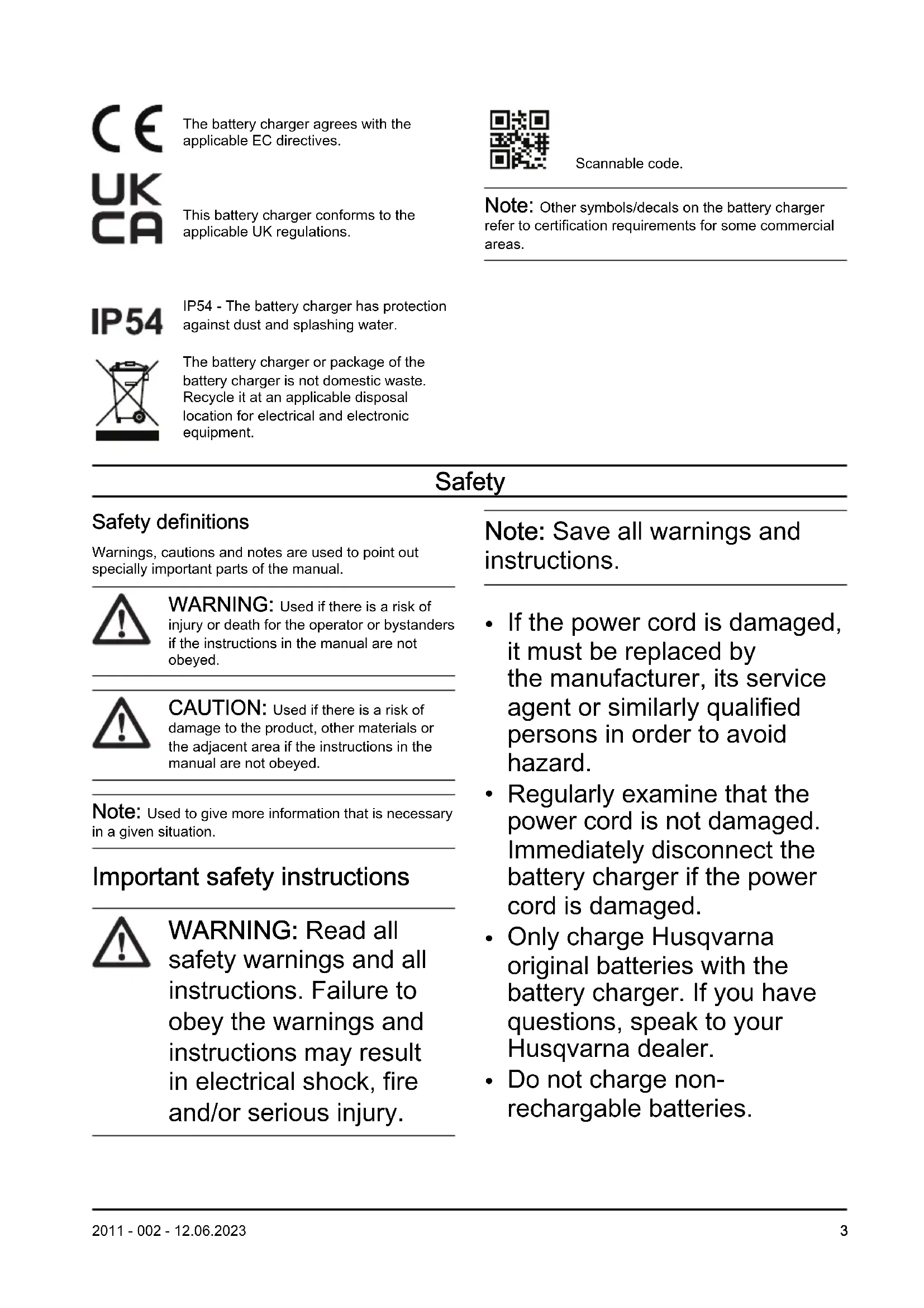 Symbols on the battery charger Read the operator's manual carefully and make sure that you understand the instructions before use. 2 2011 - 002 - 12.06.2023The battery charger agrees with the applicable EC directives. This battery charger conforms to the applicable UK regulations. IP54 - The battery charger has protection against dust and splashing water. The battery charger or package of the battery charger is not domestic waste. Recycle it at an applicable disposal location for electrical and electronic equipment. Scannable code. Note: Other symbols/decals on the battery charger refer to certification requirements for some commercial areas. Safety Safety definitions Warnings, cautions and notes are used to point out specially important parts of the manual.