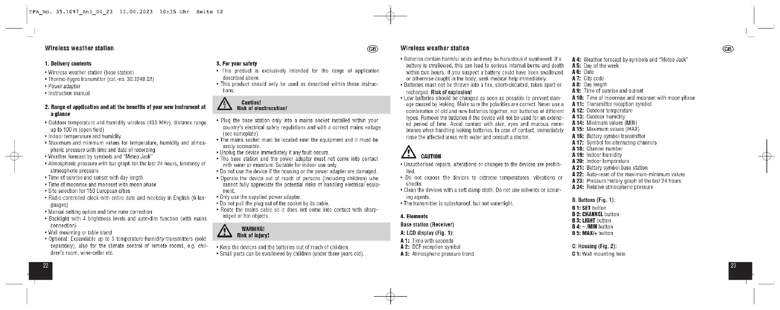 Base station (Receiver) A: LCD display (Fig. 1): A 1: Time with seconds A 2: DCF reception symbol A 3: Atmospheric pressure trend A 4: Weather forecast by symbols and “Meteo Jack” A 5: Day of the week A 6: Date A 7: City code A 8: Day length A 9: Time of sunrise and sunset A 10: Time of moonrise and moonset with moon phase A 11: Transmitter reception symbol A 12: Outdoor temperature A 13: Outdoor humidity A 14: Minimum values (MIN) A 15: Maximum values (MAX) A 16: Battery symbol transmitter A 17: Symbol for alternating channels A 18: Channel number A 19: Indoor humidity A 20: Indoor temperature A 21: Battery symbol base station A 22: Auto-reset of the maximum-minimum values A 23: Pressure history graph of the last 24 hours A 24: Relative atmospheric pressure B: Buttons (Fig. 1): B 1: SET button B 2: CHANNEL button B 3: LIGHT button B 4: – /MIN button B 5: MAX/+ button C: Housing (Fig. 2): C 1: Wall mounting hole TFA_No. 35.1097_Anl_04_23 13.04.2023 10:35 Uhr Seite 122524 Wireless weather station