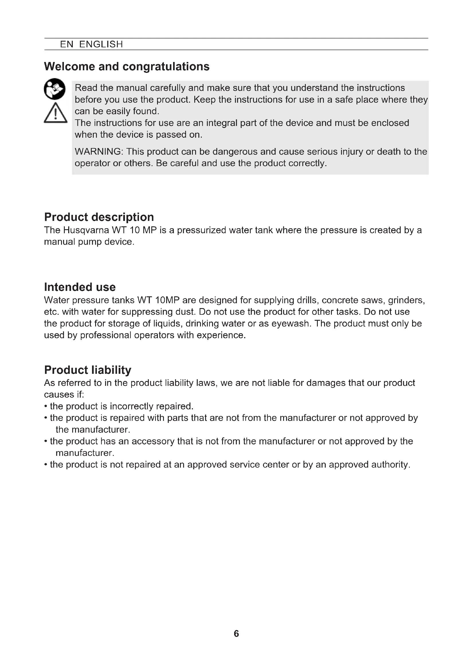 The Husqvarna WT 10 MP is a pressurized water tank where the pressure is created by a manual pump device. EN ENGLISH Welcome and congratulations Read the manual carefully and make sure that you understand the instructions before you use the product. Keep the instructions for use in a safe place where they can be easily found. The instructions for use are an integral part of the device and must be enclosed when the device is passed on.