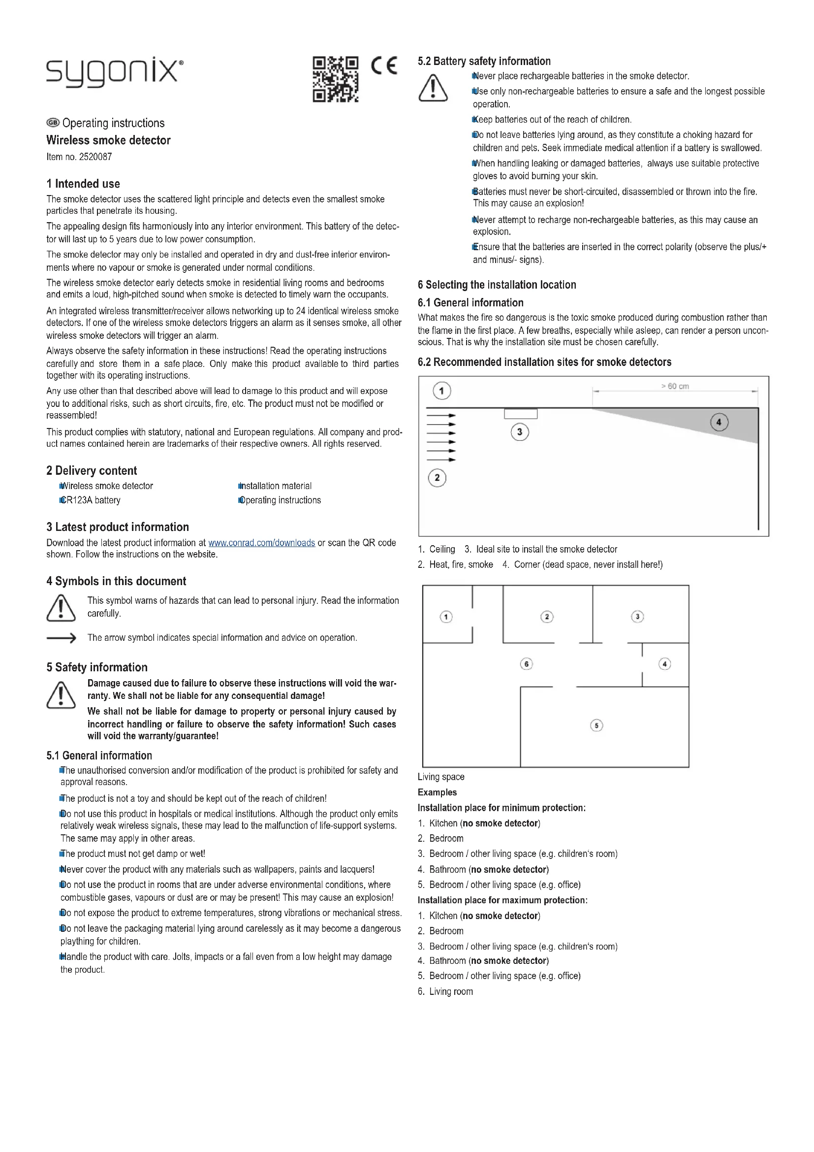 Operating instructions Wireless smoke detector Item no. 2520087 1 Intended use The smoke detector uses the scattered light principle and detects even the smallest smoke particles that penetrate its housing. The appealing design ts harmoniously into any interior environment. This battery of the detec- tor will last up to 5 years due to low power consumption. The smoke detector may only be installed and operated in dry and dust-free interior environ- ments where no vapour or smoke is generated under normal conditions. The wireless smoke detector early detects smoke in residential living rooms and bedrooms and emits a loud, high-pitched sound when smoke is detected to timely warn the occupants. An integrated wireless transmitter/receiver allows networking up to 24 identical wireless smoke detectors. If one of the wireless smoke detectors triggers an alarm as it senses smoke, all other wireless smoke detectors will trigger an alarm. Always observe the safety information in these instructions! Read the operating instructions carefully and store them in a safe place. Only make this product available to third parties together with its operating instructions. Any use other than that described above will lead to damage to this product and will expose you to additional risks, such as short circuits, re, etc. The product must not be modied or reassembled! This product complies with statutory, national and European regulations. All company and prod- uct names contained herein are trademarks of their respective owners. All rights reserved. 2 Delivery content