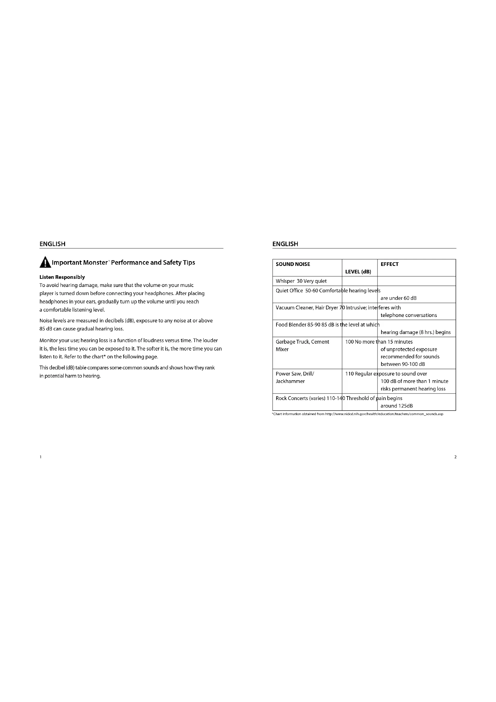 Performance and Safety Tips Listen Responsibly To avoid hearing damage, make sure that the volume on your music player is turned down before connecting your headphones. After placing headphones in your ears, gradually turn up the volume until you reach a comfortable listening level. Noise levels are measured in decibels (dB), exposure to any noise at or above 85 dB can cause gradual hearing loss. Monitor your use; hearing loss is a function of loudness versus time. The louder it is, the less time you can be exposed to it. The softer it is, the more time you can listen to it. Refer to the chart* on the following page. This decibel (dB) table compares some common sounds and shows how they rank in potential harm to hearing. SOUND NOISE LEVEL (dB) EFFECT Whisper 30 Very quiet Quiet Office 50-60 Comfortable hearing levels are under 60 dB Vacuum Cleaner, Hair Dryer 70 Intrusive; interferes with telephone conversations Food Blender 85-90 85 dB is the level at which hearing damage (8 hrs.) begins Garbage Truck, Cement Mixer 100 No more than 15 minutes of unprotected exposure recommended for sounds between 90-100 dB Power Saw, Drill/ Jackhammer 110 Regular exposure to sound over 100 dB of more than 1 minute risks permanent hearing loss Rock Concerts (varies) 110-140 Threshold of pain begins around 125dB *Chart information obtained from http://www.nidcd.nih.gov/health/education/teachers/common_sounds.asp3 ENGLISH