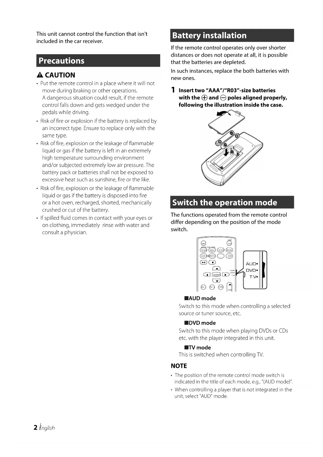 - The position of the remote control mode switch is indicated in the title of each mode, e.g., "(AUD mode)".