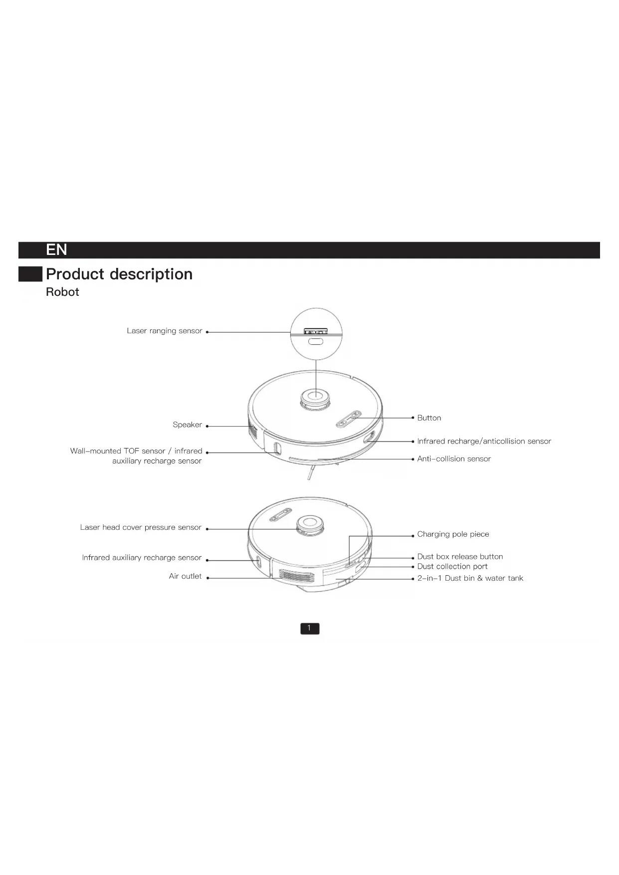 Laser ranging sensor Speaker Button Infrared recharge/anticollision sensor Anti-collision sensor Charging pole piece Dust box release button Dust collection port Wall-mounted TOF sensor / infrared auxiliary recharge sensor Laser head cover pressure sensor Infrared auxiliary recharge sensor Air outlet 2-in-1 Dust bin & water tank2