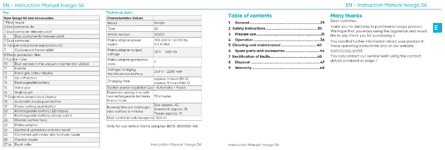 - 9 Warranty Item hoogo S6 and accessories 1 Floor nozzle 2 Dust container lid 3 Dust container release catch 4 Dust container lid release catch 5 Dust container 6 Tongue and groove application aid 7 Cyclone unit (removable) 8 Motor protection filter 9 Suction tube 10 Dust sensors in the vacuum channel (not visible) 11 Handle 12 Hand grip colour display 13 On/o button 14 Rechargeable battery 15 Hand grip 16 Wall mount 17 Operation panel colour display 18 Automatic mode push button 19 Power setting push button 20 Rechargeable battery LED display 21 Rechargeable battery release catch 22 Flexible suction hose 23 Mains adapter 24 Electrical upholstery and mite brush 25 Combined upholstery and furniture nozzle 26 Crevice nozzle 27 Brush roller Technical data 1 EN - Instruction Manual hoogo S6 Only for use with a mains adapter: BZ15-300050-AG Many thanks Dear customer, thank you for deciding to purchase a hoogo product. We hope that you enjoy using the appliance and would like to say thank you for purchasing it. You can find further information about your product in these operating instructions and on our website www.hoogo.world. You can contact our service team using the contact details provided on page 1.Instruction Manual hoogo S6 Instruction Manual hoogo S6 General Safety instructions p. 48