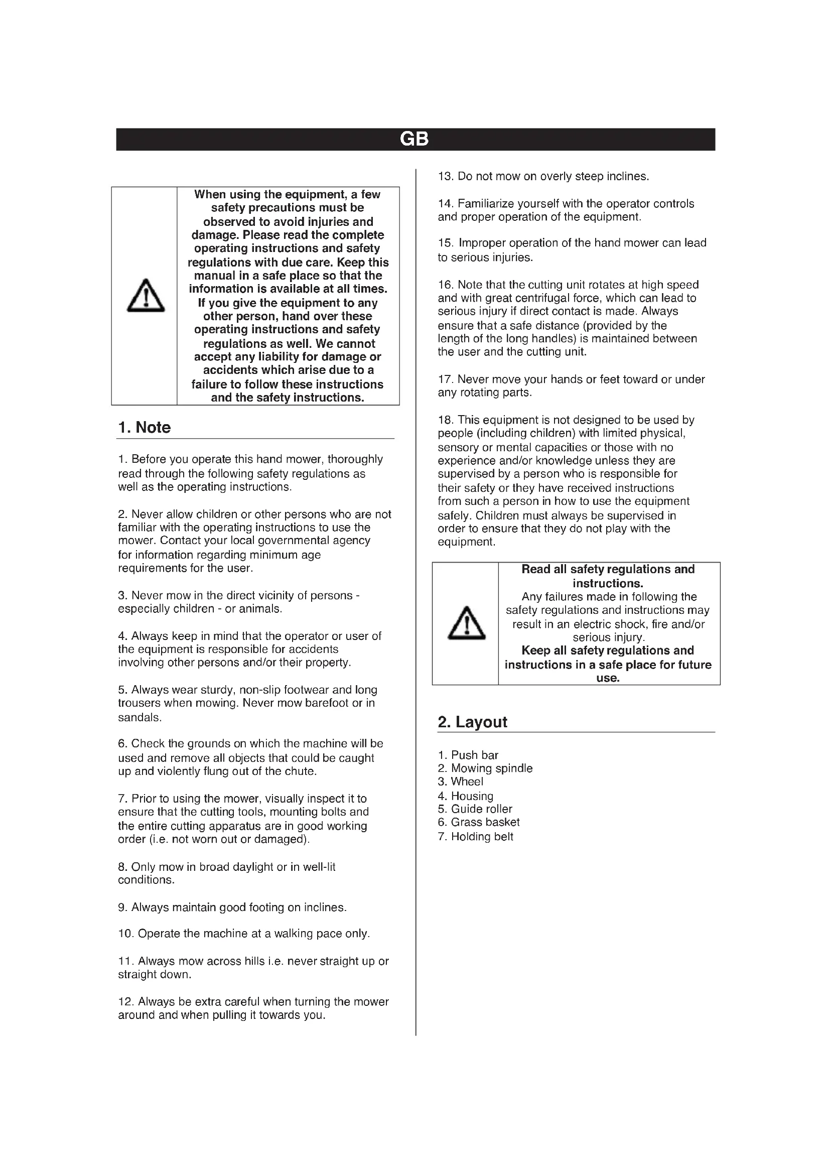 Snijbreedte: 300mm Maaihoogte: 12-45mm Gewicht: 6,7kg.GB When using the equipment, a few safety precautions must be observed to avoid injuries and damage. Please read the complete operating instructions and safety regulations with due care. Keep this manual in a safe place so that the information is available at all times. If you give the equipment to any other person, hand over these operating instructions and safety regulations as well. We cannot accept any liability for damage or accidents which arise due to a failure to follow these instructions and the safety instructions.
