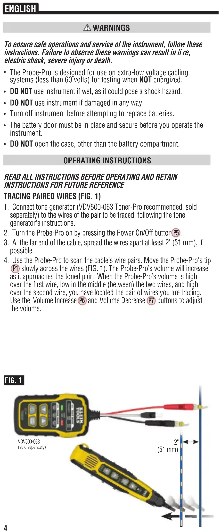 slowly across the wires (FIG. 1). The Probe-Pro’s volume will increase as it approaches the toned pair. When the Probe-Pro’s volume is high over the first wire, low in the middle (between) the two wires, and high over the second wire, you have located the pair of wires you are tracing. Use the Volume Increase