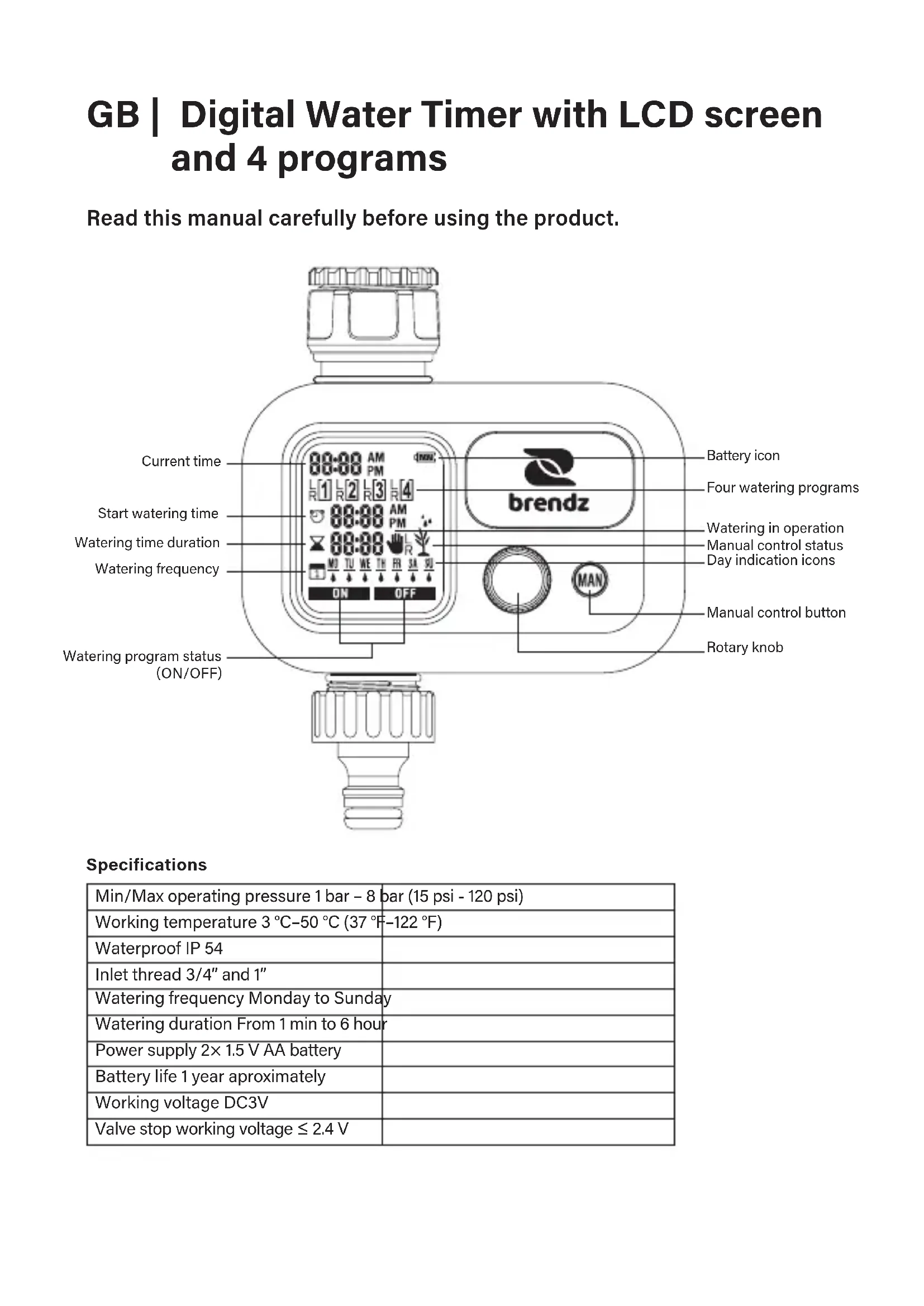 Current time Start watering time Watering time duration Watering frequency Watering program status ON/OFF Four watering programs Battery icon Watering in operation Manual control status Day indication icons Manual control button Rotary knob GB | Digital Water Timer with LCD screen and 4 programs Read this manual carefully before using the product. Specifications Min/Max operating pressure 1 bar – 8 bar (15 psi - 120 psi) Working temperature 3 °C–50 °C (37 °F–122 °F) Waterproof IP 54 Inlet thread 3/4” and 1” Watering frequency Monday to Sunday Watering duration From 1 min to 6 hour Power supply 2× 1.5 V AA battery Battery life 1 year aproximately Working voltage DC3V Valve stop working voltage ≤ 2.4 VBattery icon Maximum working time: One year Minimum working time: Four weeks Maximum working time: Four weeks Low power: replace batteries Note: When the battery is at low voltage (battery voltage ≤2.4V) the timer is forced to close the solenoid valve. Both manual and automatic functions are cancelled. Battery placement (Fig. 1)