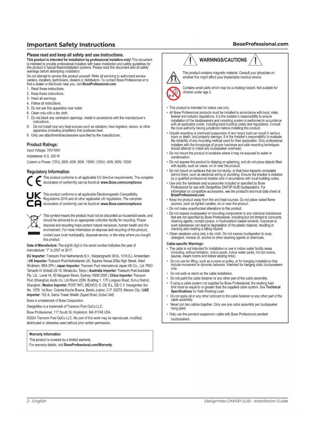 Regulatory Information This product conforms to all applicable EU directive requirements. The complete declaration of conformity can be found at: www.Bose.com/compliance. This product conforms to all applicable Electromagnetic Compatibility Regulations 2016 and all other applicable UK regulations. The complete declaration of conformity can be found at: www.Bose.com/compliance This symbol means the product must not be discarded as household waste, and should be delivered to an appropriate collection facility for recycling. Proper disposal and recycling helps protect natural resources, human health and the environment. For more information on disposal and recycling of this product, contact your local municipality, disposal service, or the shop where you bought this product. Date of Manufacture: The eighth digit in the serial number indicates the year of manufacture; “7” is 2007 or 2017. EU Importer: Transom Post Netherlands B.V., Keizersgracht 391A, 1016 EJ, Amsterdam | UK Importer: Transom Post Netherlands UK, Squires House 205a High Street, West Wickham, BR4 0PH | Japan Importer: Transom Post International Japan KK Co., Ltd. PMO Tamachi IV Shiba5-29-19, Minato-ku, Tokyo | Australia Importer: Transom Post Australia Pty. Ltd., Level 14, 60 Margaret Street, Sydney, NSW 2000 | China Importer: Transom Post (Shanghai) Audio Co. Ltd Room 2209, Building 1, 175 Longyao Road, Xuhui District, Shanghai | Mexico Importer: POST INTL MEXICO, S. DE R.L. DE C.V. Insurgentes Sur No. 1079, 1st oor, Colonia Noche Buena, Benito Juárez, C.P. 03270, Mexico City | UAE Importer: 102 A, Sama Tower Sheikh Zayed Road, Dubai UAE Bose is a trademark of Bose Corporation. DesignMax is a trademark of Transom Post OpCo LLC. Bose Professional, 117 South St, Hopkinton, MA 01748 USA ©2024 Transom Post OpCo LLC. No part of this work may be reproduced, modied, distributed or otherwise used without prior written permission. Warranty Information This product is covered by a limited warranty. For warranty details, visit BoseProfessional.com/Warranty. Product Ratings: Input Voltage: 70V/100V Impedance: 8 Ω, 250 W Current or Power: (70V): 20W, 40W, 80W, 150W; (100V): 40W, 80W, 150W WARNINGS/CAUTIONS This product contains magnetic material. Consult your physician on whether this might affect your implantable medical device. Contains small parts which may be a choking hazard. Not suitable for children under age 3.