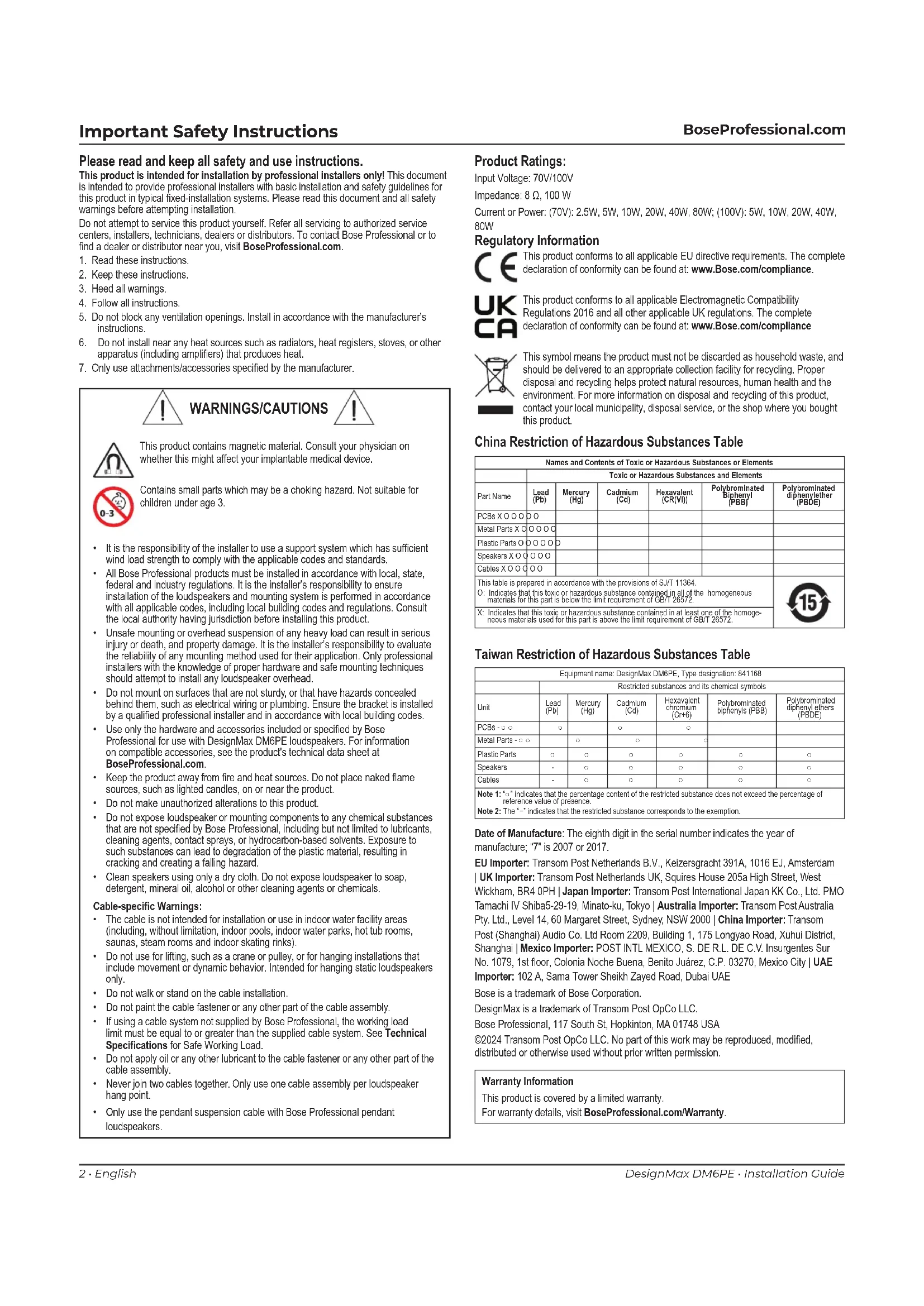 Regulatory Information This product conforms to all applicable EU directive requirements. The complete declaration of conformity can be found at: www.Bose.com/compliance. This product conforms to all applicable Electromagnetic Compatibility Regulations 2016 and all other applicable UK regulations. The complete declaration of conformity can be found at: www.Bose.com/compliance This symbol means the product must not be discarded as household waste, and should be delivered to an appropriate collection facility for recycling. Proper disposal and recycling helps protect natural resources, human health and the environment. For more information on disposal and recycling of this product, contact your local municipality, disposal service, or the shop where you bought this product. China Restriction of Hazardous Substances Table Names and Contents of Toxic or Hazardous Substances or Elements Toxic or Hazardous Substances and Elements Part Name Lead (Pb) Mercury (Hg) Cadmium (Cd) Hexavalent (CR(VI)) Polybrominated Biphenyl (PBB) Polybrominated diphenylether (PBDE) PCBs X O O O O O Metal Parts X O O O O O Plastic Parts O O O O O O Speakers X O O O O O Cables X O O O O O This table is prepared in accordance with the provisions of SJ/T 11364. O: Indicates that this toxic or hazardous substance contained in all of the homogeneous materials for this part is below the limit requirement of GB/T 26572. X: Indicates that this toxic or hazardous substance contained in at least one of the homoge- neous materials used for this part is above the limit requirement of GB/T 26572. Taiwan Restriction of Hazardous Substances Table Equipment name: DesignMax DM6PE, Type designation: 841168 Restricted substances and its chemical symbols Unit Lead (Pb) Mercury (Hg) Cadmium (Cd) Hexavalent chromium (Cr+6) Polybrominated biphenyls (PBB) Polybrominated diphenyl ethers (PBDE) PCBs - ○ ○ ○ ○ ○ Metal Parts - ○ ○ ○ ○ ○ Plastic Parts ○ ○ ○ ○ ○ ○ Speakers - ○ ○ ○ ○ ○ Cables - ○ ○ ○ ○ ○ Note 1: “○” indicates that the percentage content of the restricted substance does not exceed the percentage of reference value of presence. Note 2: The “−” indicates that the restricted substance corresponds to the exemption. Date of Manufacture: The eighth digit in the serial number indicates the year of manufacture; “7” is 2007 or 2017. EU Importer: Transom Post Netherlands B.V., Keizersgracht 391A, 1016 EJ, Amsterdam | UK Importer: Transom Post Netherlands UK, Squires House 205a High Street, West Wickham, BR4 0PH | Japan Importer: Transom Post International Japan KK Co., Ltd. PMO Tamachi IV Shiba5-29-19, Minato-ku, Tokyo | Australia Importer: Transom Post Australia Pty. Ltd., Level 14, 60 Margaret Street, Sydney, NSW 2000 | China Importer: Transom Post (Shanghai) Audio Co. Ltd Room 2209, Building 1, 175 Longyao Road, Xuhui District, Shanghai | Mexico Importer: POST INTL MEXICO, S. DE R.L. DE C.V. Insurgentes Sur No. 1079, 1st oor, Colonia Noche Buena, Benito Juárez, C.P. 03270, Mexico City | UAE Importer: 102 A, Sama Tower Sheikh Zayed Road, Dubai UAE Bose is a trademark of Bose Corporation. DesignMax is a trademark of Transom Post OpCo LLC. Bose Professional, 117 South St, Hopkinton, MA 01748 USA ©2024 Transom Post OpCo LLC. No part of this work may be reproduced, modied, distributed or otherwise used without prior written permission. Warranty Information This product is covered by a limited warranty. For warranty details, visit BoseProfessional.com/Warranty. Product Ratings: Input Voltage: 70V/100V Impedance: 8 Ω, 100 W Current or Power: (70V): 2.5W, 5W, 10W, 20W, 40W, 80W; (100V): 5W, 10W, 20W, 40W, 80W WARNINGS/CAUTIONS This product contains magnetic material. Consult your physician on whether this might affect your implantable medical device. Contains small parts which may be a choking hazard. Not suitable for children under age 3.