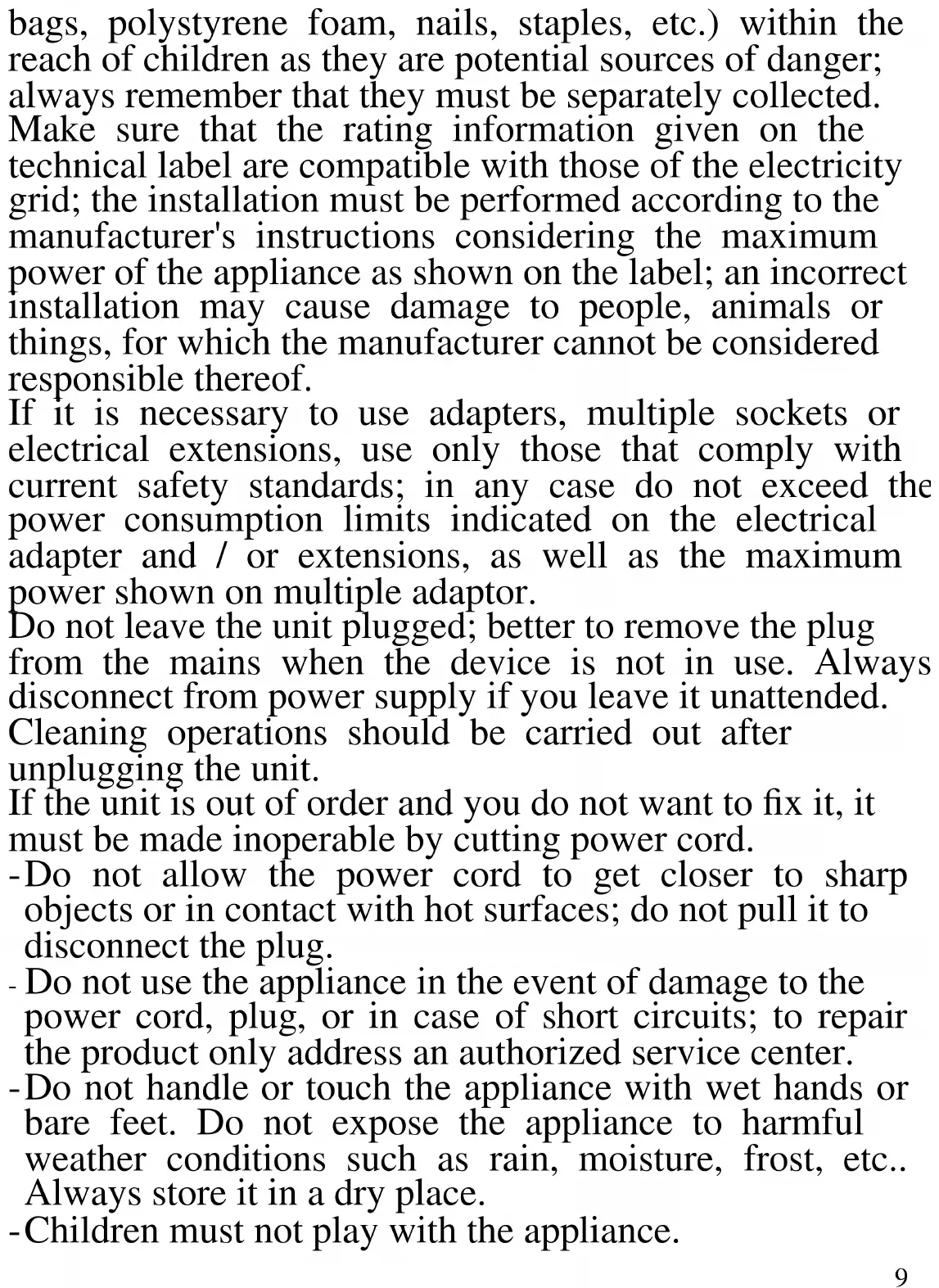 The following are important notes on the installation, use and maintenance; save this instruction manual for future reference; use the equipment only as specified in this guide; any other use is considered improper and dangerous; therefore, the manufacturer cannot be held responsible in the event of damages caused by improper, incorrect or unreasonable use. Before use, ensure the equipment is undamaged; if in doubt, do not attempt to use it and contact the authorized service center; do not leave packing materials (i.e. plastic9 bags, polystyrene foam, nails, staples, etc.) within the reach of children as they are potential sources of danger; always remember that they must be separately collected. Make sure that the rating information given on the technical label are compatible with those of the electricity grid; the installation must be performed according to the manufacturer's instructions considering the maximum power of the appliance as shown on the label; an incorrect installation may cause damage to people, animals or things, for which the manufacturer cannot be considered responsible thereof. If it is necessary to use adapters, multiple sockets or electrical extensions, use only those that comply with current safety standards; in any case do not exceed the power consumption limits indicated on the electrical adapter and / or extensions, as well as the maximum power shown on multiple adaptor. Do not leave the unit plugged; better to remove the plug from the mains when the device is not in use. Always disconnect from power supply if you leave it unattended. Cleaning operations should be carried out after unplugging the unit. If the unit is out of order and you do not want to fix it, it must be made inoperable by cutting power cord. - Do not allow the power cord to get closer to sharp objects or in contact with hot surfaces; do not pull it to disconnect the plug. - Do not use the appliance in the event of damage to the power cord, plug, or in case of short circuits; to repair the product only address an authorized service center. - Do not handle or touch the appliance with wet hands or bare feet. Do not expose the appliance to harmful weather conditions such as rain, moisture, frost, etc.. Always store it in a dry place. - Children must not play with the appliance.10 - This appliance can be used by children of 8 years and above and persons with reduced physical, sensory or mental capabilities or lack of experience and knowledge if they received supervision or instruction concerning use of the appliance in a safe way and understand hazards involved; children shall not play with the appliance; cleaning and user maintenance shall not be made by children without supervision. - Keep the appliance and its cord out of reach of children less than 8 years. If the power cord is damaged, or in case of failure and / or malfunction do not tamper with the unit. The reparation must be done by manufacturer or by service center authorized by the manufacturer in order to prevent any risk. Failure to comply with the above may compromise the unit safety and invalidate the warranty.