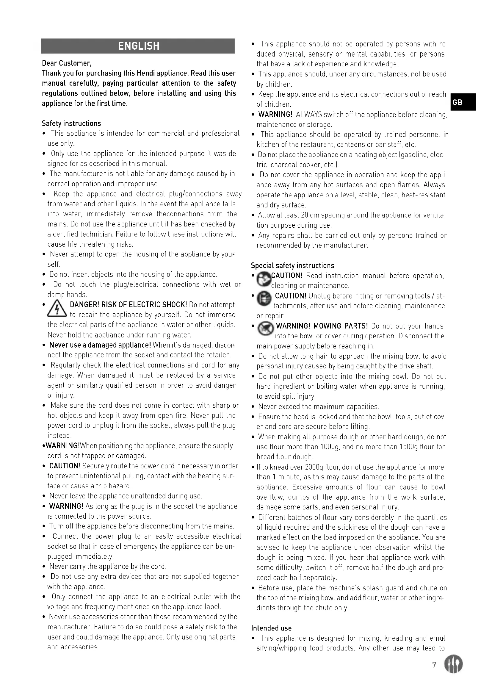 ENGLISH Dear Customer, Thank you for purchasing this Hendi appliance. Read this user manual carefully, paying particular attention to the safety regulations outlined below, before installing and using this appliance for the first time. Safety instructions