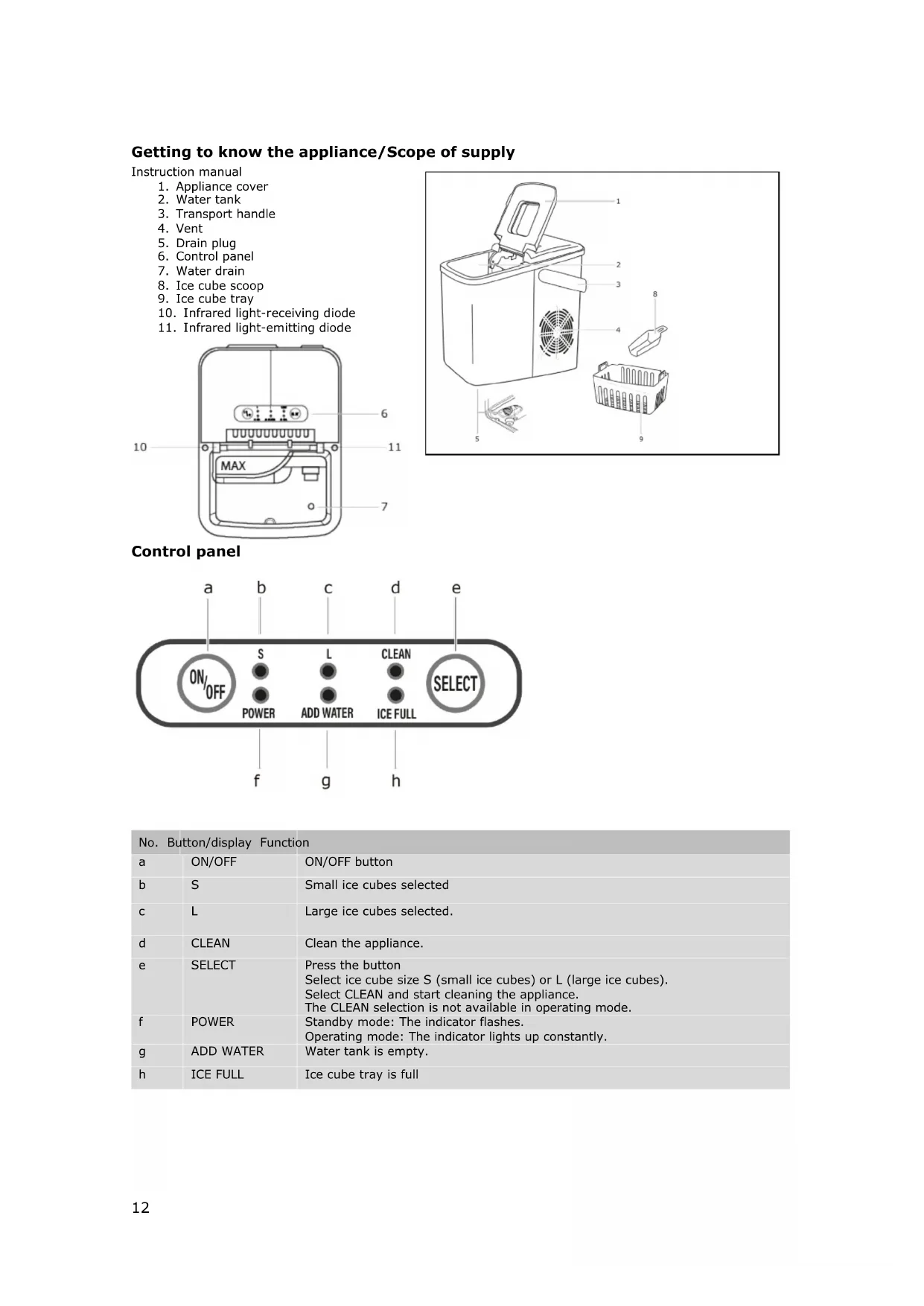 SELECT Press the button Select ice cube size S (small ice cubes) or L (large ice cubes). Select CLEAN and start cleaning the appliance. The CLEAN selection is not available in operating mode.