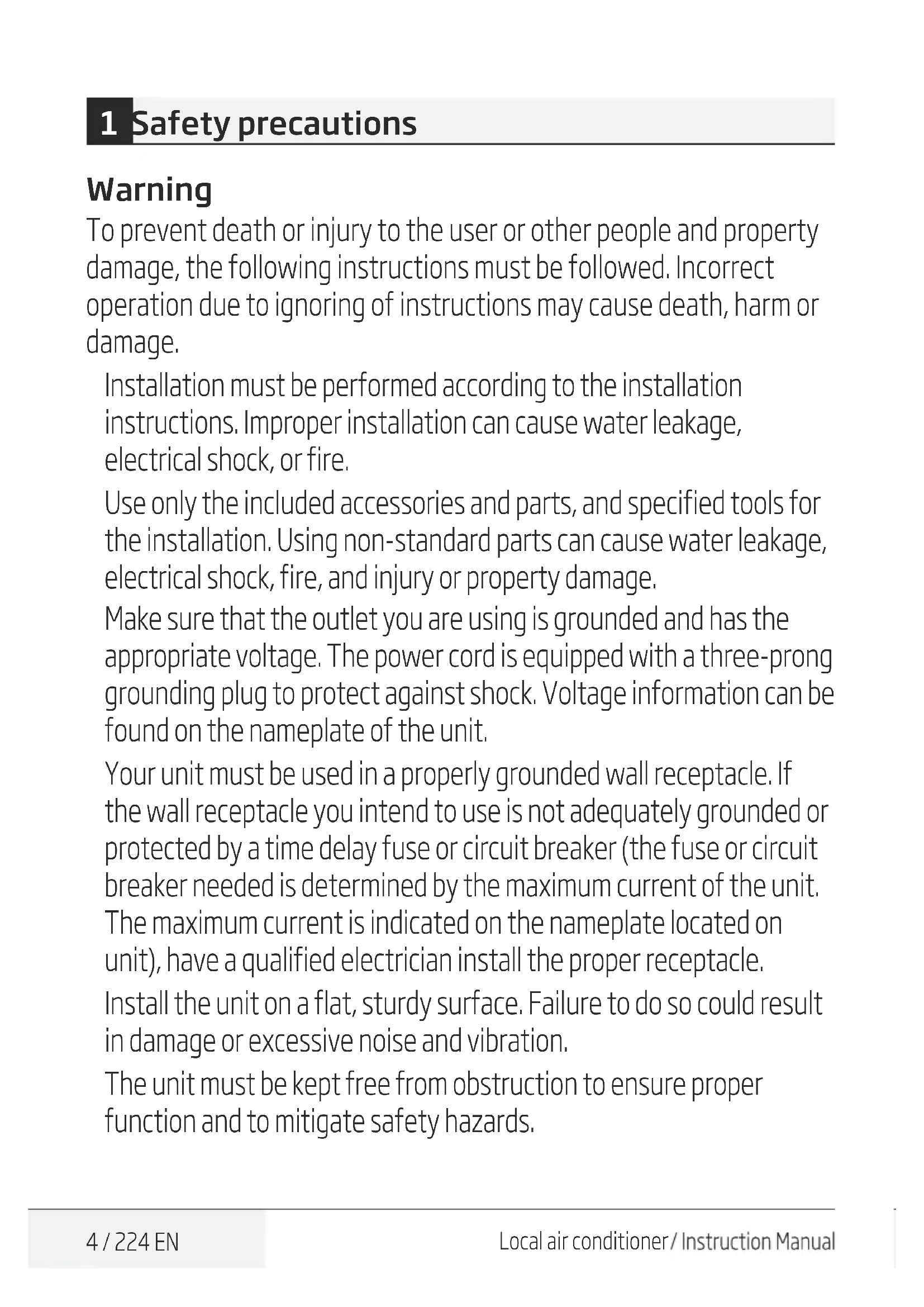 Local air conditioner4 / 224 EN 1 Safety precautons Warning To prevent death or injury to the user or other people and property damage, the following instructions must be followed. Incorrect operation due to ignoring of instructions may cause death, harm or damage.