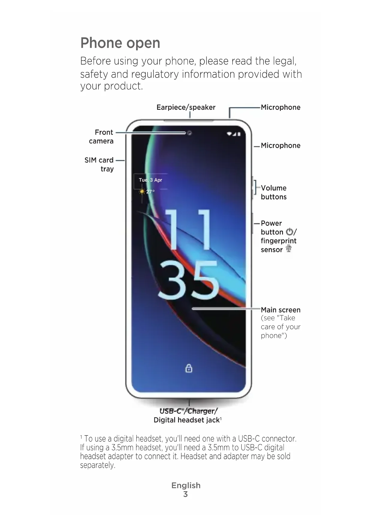 1 To use a digital headset, you'll need one with a USB-C connector. If using a 3.5mm headset, you'll need a 3.5mm to USB-C digital headset adapter to connect it. Headset and adapter may be sold separately. English4 Phone back Ready For: your phone works with Ready For, a new platform that extends your phone's experience to any compatible PC, TV, tablet or monitor. To learn more, scan the QR code or visit www.motorola.com/ready-for. MicrophoneSpeaker Main camera Ultra-wide/ macro camera Flash External display NFC touchpoint Wireless charging area2 Prox imity sensor 2 Charge your phone using a Qi-certified wireless charger (sold separately).5 Put in a physical SIM card Your phone supports using a physical SIM card. 1 With the phone closed and the external display facing down, insert the SIM tool into the tray hole to pop out the tray. Make sure that you use a standard nano SIM card and don't cut the SIM card. 2 Insert the SIM card with the gold contacts down and the notch aligned with the card tray, then gently push the tray into the slot. eSIM option: your phone may have an eSIM (embedded SIM card) in addition to the physical SIM card. Contact your service provider for details if you want to activate and use it. Connect with 5G: 5G service plan and 5G network coverage required; available only in selected areas; device not compatible with all 5G networks. Contact your service provider for details. Power on and o Press and hold the power button to turn it on, then follow the prompts to get started. Press the power and volume up buttons at the same time to turn it o. Nano SIM6 Take care of your phone To guarantee your warranty service and ensure that you have a satisfying phone experience, please care for your phone as follows: