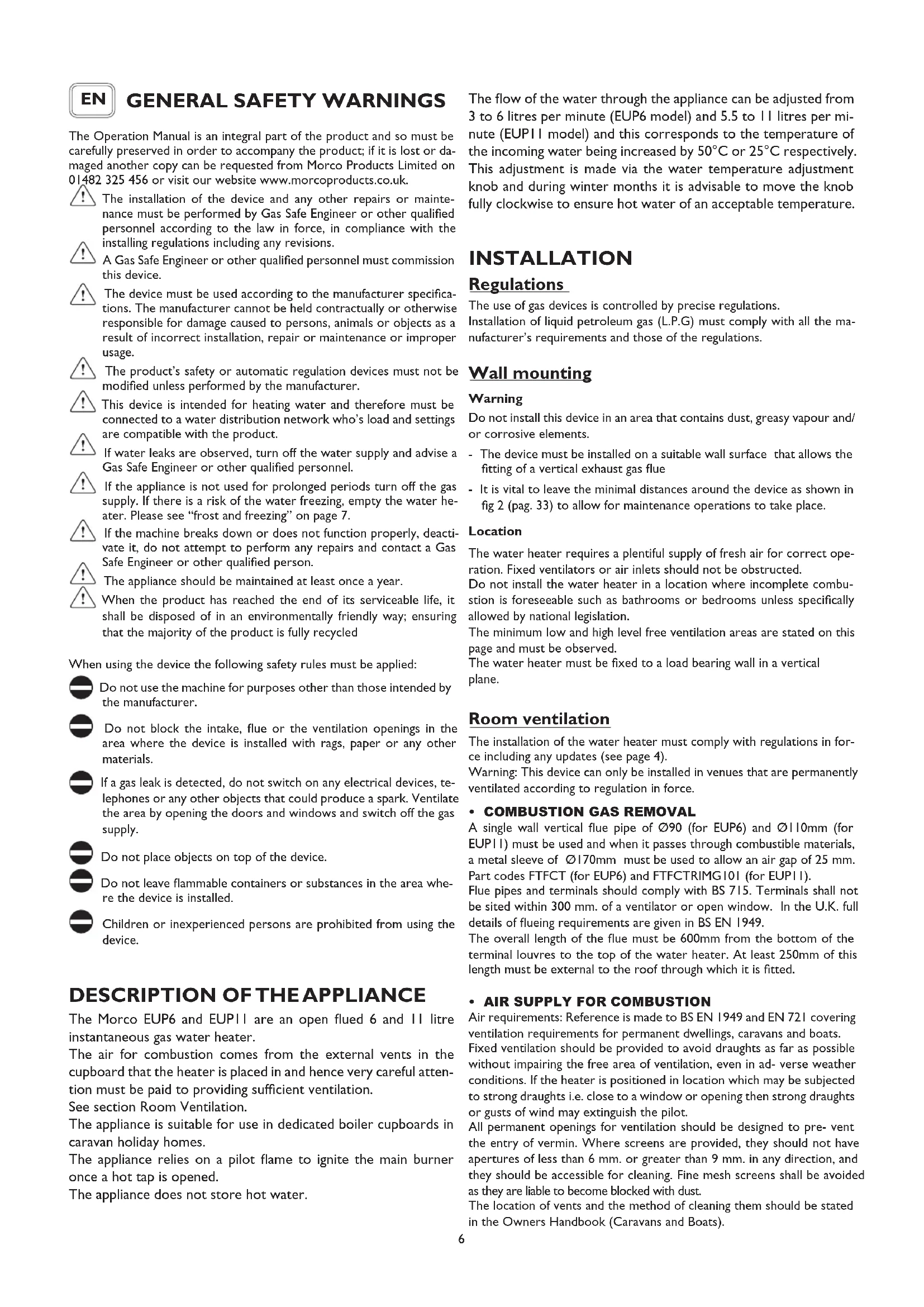The Morco EUP6 and EUP11 are an open ued 6 and 11 litre instantaneous gas water heater. The air for combustion comes from the external vents in the cupboard that the heater is placed in and hence very careful atten- tion must be paid to providing sufcient ventilation. See section Room Ventilation. The appliance is suitable for use in dedicated boiler cupboards in caravan holiday homes. The appliance relies on a pilot ame to ignite the main burner once a hot tap is opened. The appliance does not store hot water. The ow of the water through the appliance can be adjusted from 3 to 6 litres per minute (EUP6 model) and 5.5 to 11 litres per mi- nute (EUP11 model) and this corresponds to the temperature of the incoming water being increased by 50°C or 25°C respectively. This adjustment is made via the water temperature adjustment knob and during winter months it is advisable to move the knob fully clockwise to ensure hot water of an acceptable temperature. INSTALLATION Regulations The use of gas devices is controlled by precise regulations. Installation of liquid petroleum gas (L.P.G) must comply with all the ma- nufacturer’s requirements and those of the regulations. Wall mounting Warning Do not install this device in an area that contains dust, greasy vapour and/ or corrosive elements. - The device must be installed on a suitable wall surface that allows the tting of a vertical exhaust gas ue - It is vital to leave the minimal distances around the device as shown in g 2 (pag. 33) to allow for maintenance operations to take place. Location The water heater requires a plentiful supply of fresh air for correct ope- ration. Fixed ventilators or air inlets should not be obstructed. Do not install the water heater in a location where incomplete combu- stion is foreseeable such as bathrooms or bedrooms unless specically allowed by national legislation. The minimum low and high level free ventilation areas are stated on this page and must be observed. The water heater must be xed to a load bearing wall in a vertical plane. Room ventilation The installation of the water heater must comply with regulations in for- ce including any updates (see page 4).