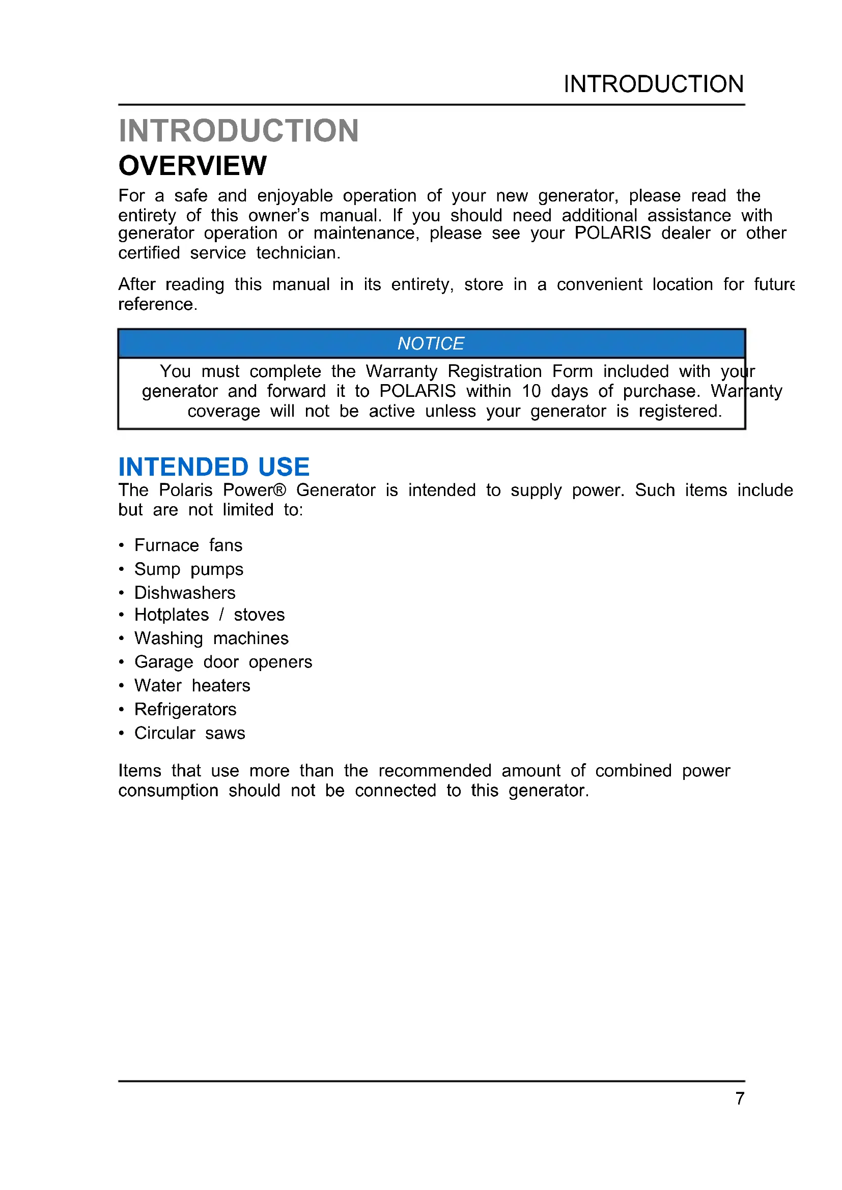 TROUBLESHOOTINGWARRANTY LIMITED WARRANTY POLARIS Sales Inc., 2100 Highway 55, Medina, MN 55340 gives a THREE YEAR LIMITED WARRANTY for consumer use and a ONE YEAR LIMITED WARRANTY for commercial use on all components of your POLARIS generator against defects in material or workmanship. This warranty covers parts and labor charges for repair or replacement of defective parts and begins on the date of purchase. This warranty is transferable to another owner during the warranty period through a POLARIS dealer, but any such transfer will not extend the original term of the warranty. REGISTRATION The Warranty Registration Form must be completed by the purchaser and submitted to POLARIS within ten days of purchase. Upon receipt of this registration, POLARIS will record the registration information for warranty. No verification of registration will be sent to the purchaser. Registration cards can be found in the original box of the product and can be mailed into POLARIS at the address listed on the card, or completed at www.polarispower.com/warranty. NO WARRANTY COVERAGE WILL BE ALLOWED UNLESS YOUR GENERATOR IS REGISTERED WITH POLARIS.