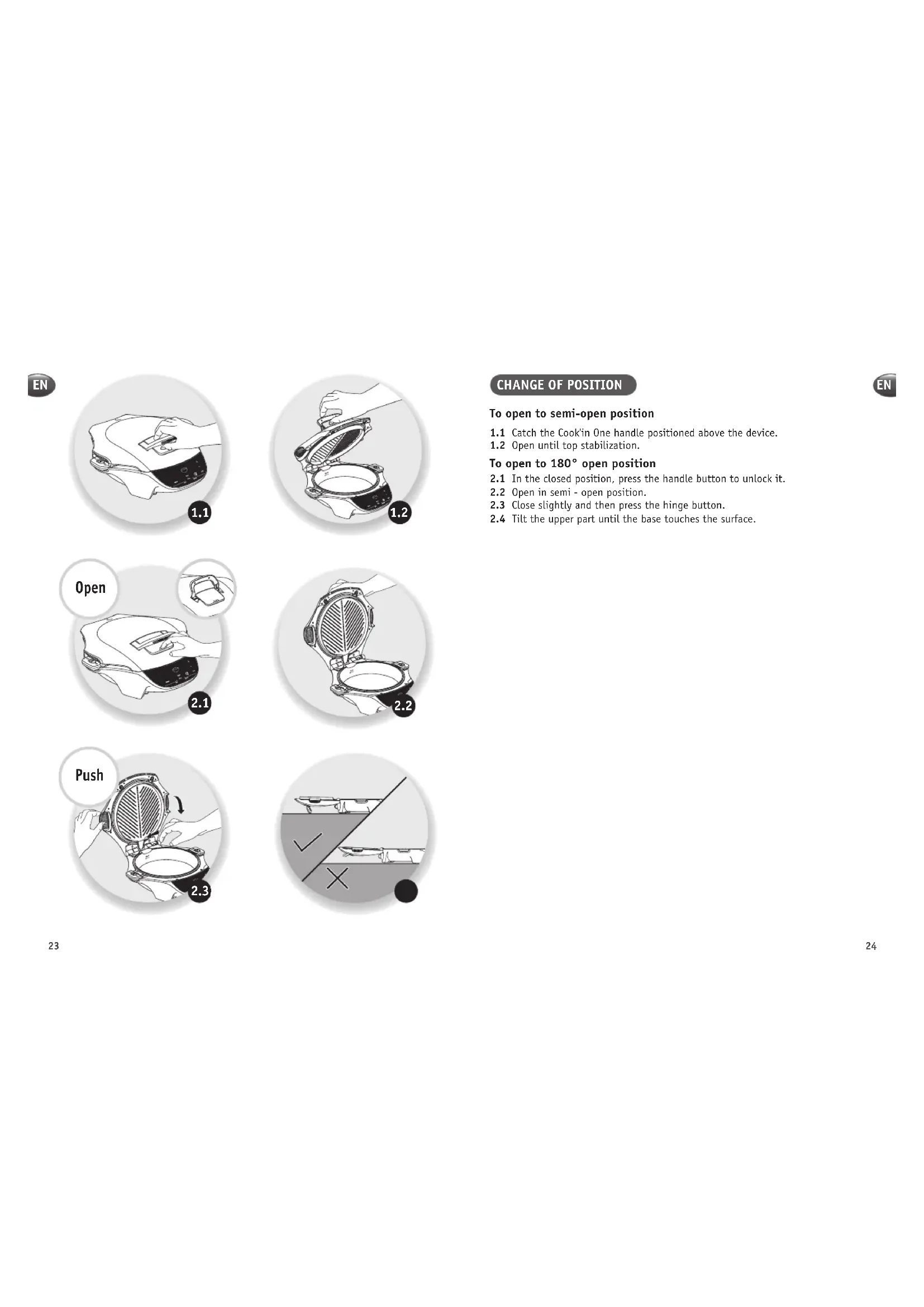 Check that the pot is properly installed. Unplug the appliance and wait a few minutes. Then plug in your appliance again and turn it on. If the problem persists, contact your customer service or a repair centre. The displayed time flashes. If the displayed time is correct, press START/STOP to confirm. The displayed thermostat flashes If the displayed thermostat is correct, press START/STOP to confirm. The illuminated programme flashes If the displayed programme is correct, press START/STOP to confirm. The time has reached 00, but the level of cooking is insufficient At the end of cooking, after turning off the beep sound by pressing START/STOP once, close the appliance again and add some time using the – and + buttons, then confirm by pressing START/STOP. Once a cooking programme has been started, it is not possible to change the cooking time Once the programme has started, wait for the preheating time to finish before changing the time using the – and + buttons. Key malfunction Unplug the appliance and wait a few minutes. Then plug in your appliance again and turn it on. If the problem persists, contact your customer service or a repair centre. The cooking result is not as expected. Follow the Moulinex recipes available on the app. Liquid flow on the worktop and/or on the contour of the Cook'in one. Cooking of liquids must always be carried out in open mode in order to prevent a large amount of steam from being released on opening and liquid potentially flowing onto the worktop. The product is not stable in the 180° open position. Check that the handle is in the support position, 180° open (see page 23) and that it touches the worktop. There is a gap between the top plate and the pot when the product is closed. Check that the top plate and the pot are correctly installed. Programmes Recipes Quantity Cooking time Recommended position Preheating "Keep warm" mode