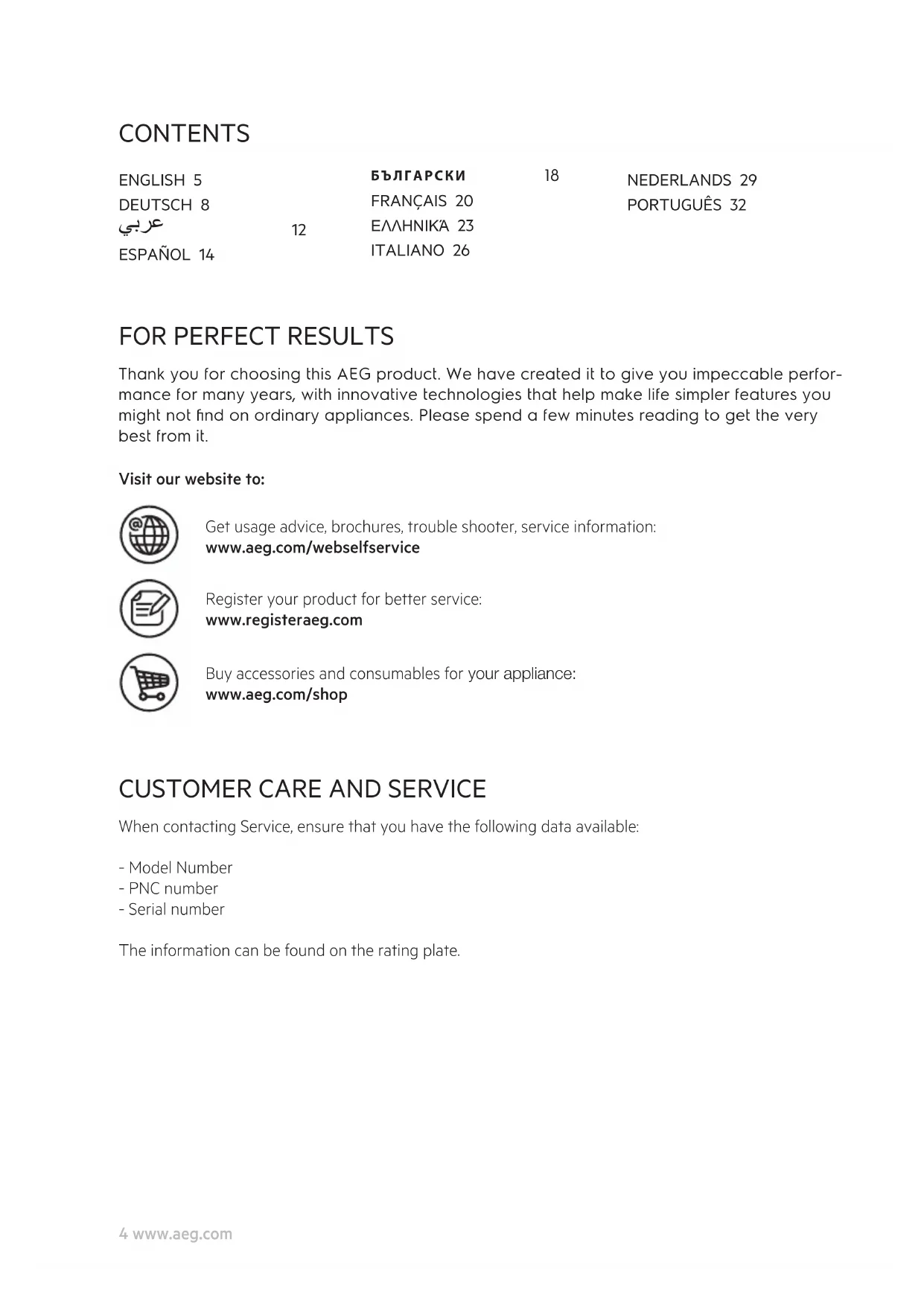 84 www.aeg.com Visit our website to: Get usage advice, brochures, trouble shooter, service information: www.aeg.com/webselfservice Register your product for better service: www.registeraeg.com Buy accessories and consumables for your appliance: www.aeg.com/shop CONTENTS ENGLISH 5 DEUTSCH 8