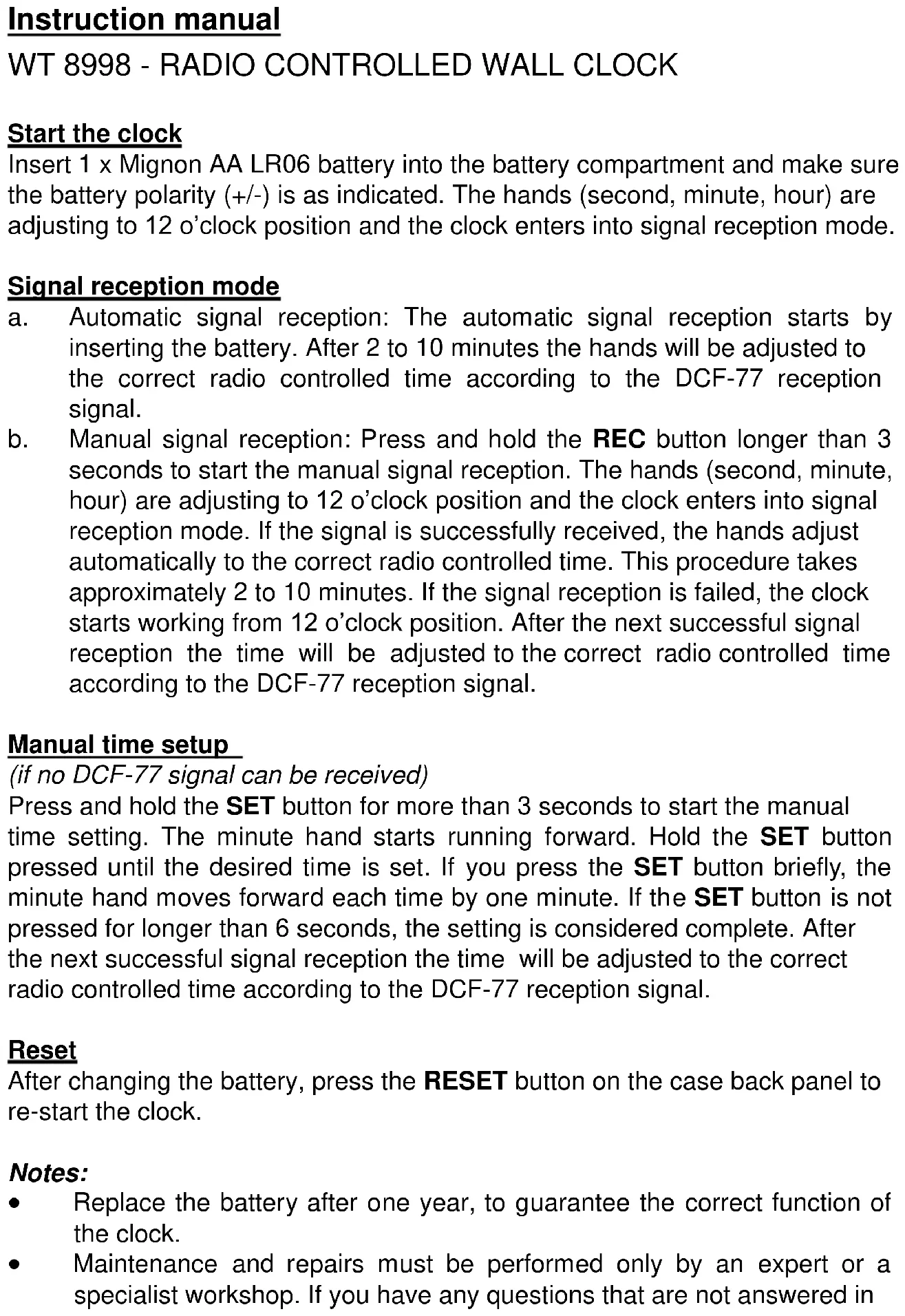 Start the clock Insert 1 x Mignon AA LR06 battery into the battery compartment and make sure the battery polarity (+/-) is as indicated. The hands (second, minute, hour) are adjusting to 12 o’clock position and the clock enters into signal reception mode. Signal reception mode a. Automatic signal reception: The automatic signal reception starts by inserting the battery. After 2 to 10 minutes the hands will be adjusted to the correct radio controlled time according to the DCF-77 reception signal. b. Manual signal reception: Press and hold the REC button longer than 3 seconds to start the manual signal reception. The hands (second, minute, hour) are adjusting to 12 o’clock position and the clock enters into signal reception mode. If the signal is successfully received, the hands adjust automatically to the correct radio controlled time. This procedure takes approximately 2 to 10 minutes. If the signal reception is failed, the clock starts working from 12 o’clock position. After the next successful signal reception the time will be adjusted to the correct radio controlled time according to the DCF-77 reception signal. Manual time setup (if no DCF-77 signal can be received) Press and hold the SET button for more than 3 seconds to start the manual time setting. The minute hand starts running forward. Hold the SET button pressed until the desired time is set. If you press the SET button briefly, the minute hand moves forward each time by one minute. If the SET button is not pressed for longer than 6 seconds, the setting is considered complete. After the next successful signal reception the time will be adjusted to the correct radio controlled time according to the DCF-77 reception signal. Reset After changing the battery, press the RESET button on the case back panel to re-start the clock. Notes: Replace the battery after one year, to guarantee the correct function of the clock. Maintenance and repairs must be performed only by an expert or a specialist workshop. If you have any questions that are not answered inthis manual, please contact our Technical Advisory Service or an other specialist. Hereby, Technotrade declares that this product WT 8998 is in compliance with the essential requirements and other relevant provisions of Directive 2014/53/EU and ROHS 2011/65/EC. The original EU declaration of conformity may be found at: www.technoline.de/doc/4029665089980 Environmental reception effects The clock obtains the accurate time with wireless technology. Same as all wireless devices, the reception is maybe affected by the following circumstances: long transmitting distance nearby mountains and valleys near freeway, railway, airports, high voltage cable etc. near construction site among tall buildings inside concrete buildings near electrical appliances (computers, TV’s, etc) and metallic structures inside moving vehicles Place the clock at a location with optimal signal, i.e. close to a window and away from metal surfaces or electrical appliances. Precautions Do not subject the unit to excessive force or shock. Do not expose the unit to extreme temperatures, direct sunlight, dust or humidity. Do not immerse in water. Avoid contact with any corrosive materials. Do not dispose this unit in a fire as it may explode. Do not open the inner back case or tamper with any components of this unit. Batteries safety warnings Use only alkaline batteries, not rechargeable batteries. Install batteries correctly by matching the polarities (+/-). Always replace a complete set of batteries. Never mix used and new batteries. Remove exhausted batteries immediately. Remove batteries when not in use. Do not recharge and do not dispose of batteries in fire as the batteries may explode. Ensure batteries are stored away from metal objects as contact may cause a short circuit. Avoid exposing batteries to extreme temperature or humidity or direct sunlight. Keep all batteries out of reach from children. They are a choking hazard. Use the product only for its intended purpose! Consideration of duty according to the battery law Old batteries do not belong to domestic waste because they could cause damages of health and environment. You can return used batteries free of charge to your dealer and collection points. As end-user you are committed by law to bring back needed batteries to distributors and other collecting points! Consideration of duty according to the law of electrical devices This symbol means that you must dispose of electrical devices separated from the General household waste when it reaches the end of its useful life. Take your unit to your local waste collection point or recycling centre. This applies to all countries of the European Union, and to other European countries with a separate waste collection system.Manuel d’instruction