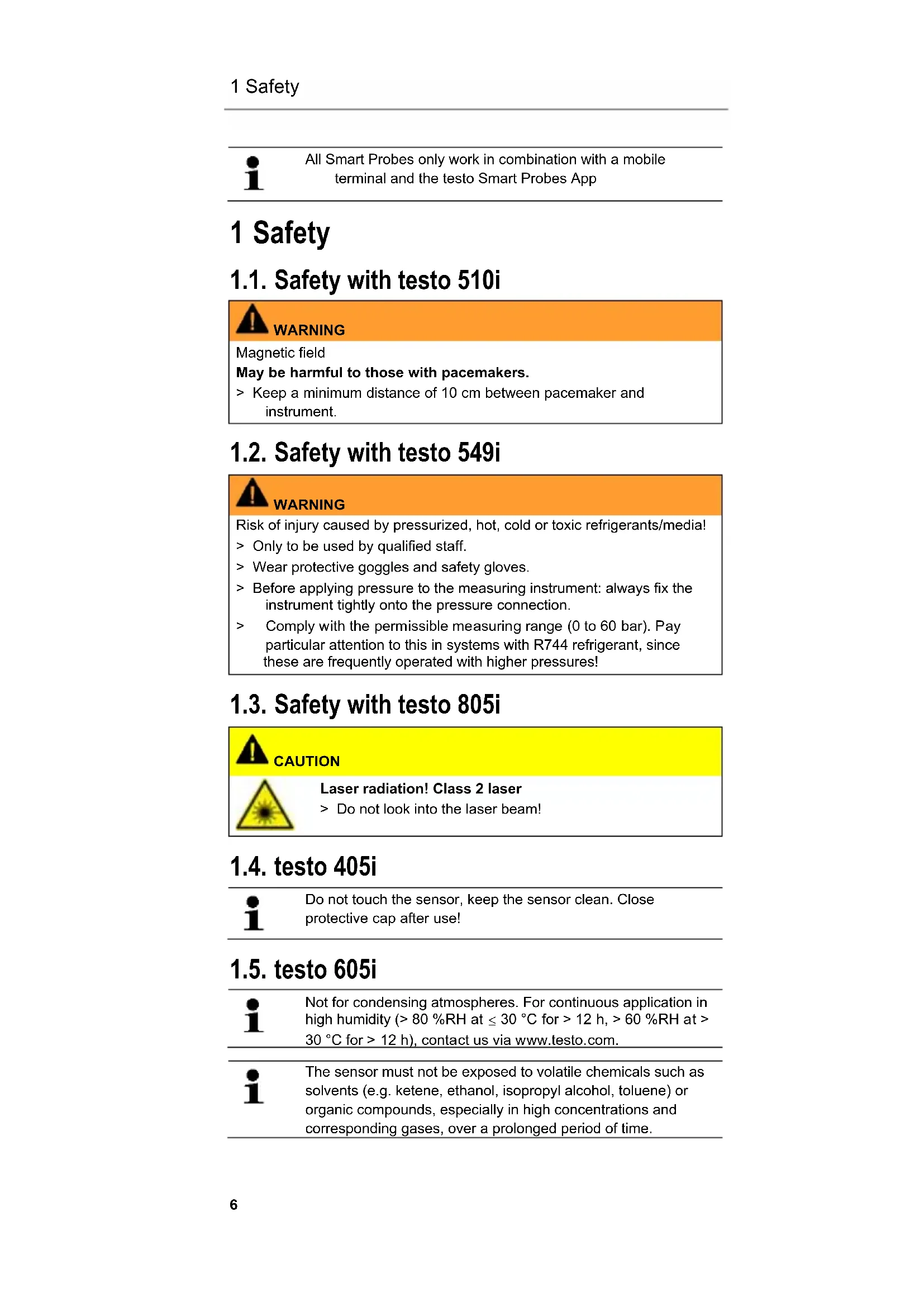 All Smart Probes only work in combination with a mobile terminal and the testo Smart Probes App 1 Safety 1.1. Safety with testo 510i WARNING Magnetic field May be harmful to those with pacemakers. > Keep a minimum distance of 10 cm between pacemaker and instrument. 1.2. Safety with testo 549i WARNING Risk of injury caused by pressurized, hot, cold or toxic refrigerants/media! > Only to be used by qualified staff. > Wear protective goggles and safety gloves. > Before applying pressure to the measuring instrument: always fix the instrument tightly onto the pressure connection. > Comply with the permissible measuring range (0 to 60 bar). Pay particular attention to this in systems with R744 refrigerant, since these are frequently operated with higher pressures! 1.3. Safety with testo 805i CAUTION Laser radiation! Class 2 laser > Do not look into the laser beam! 1.4. testo 405i Do not touch the sensor, keep the sensor clean. Close protective cap after use! 1.5. testo 605i Not for condensing atmospheres. For continuous application in high humidity (> 80 %RH at