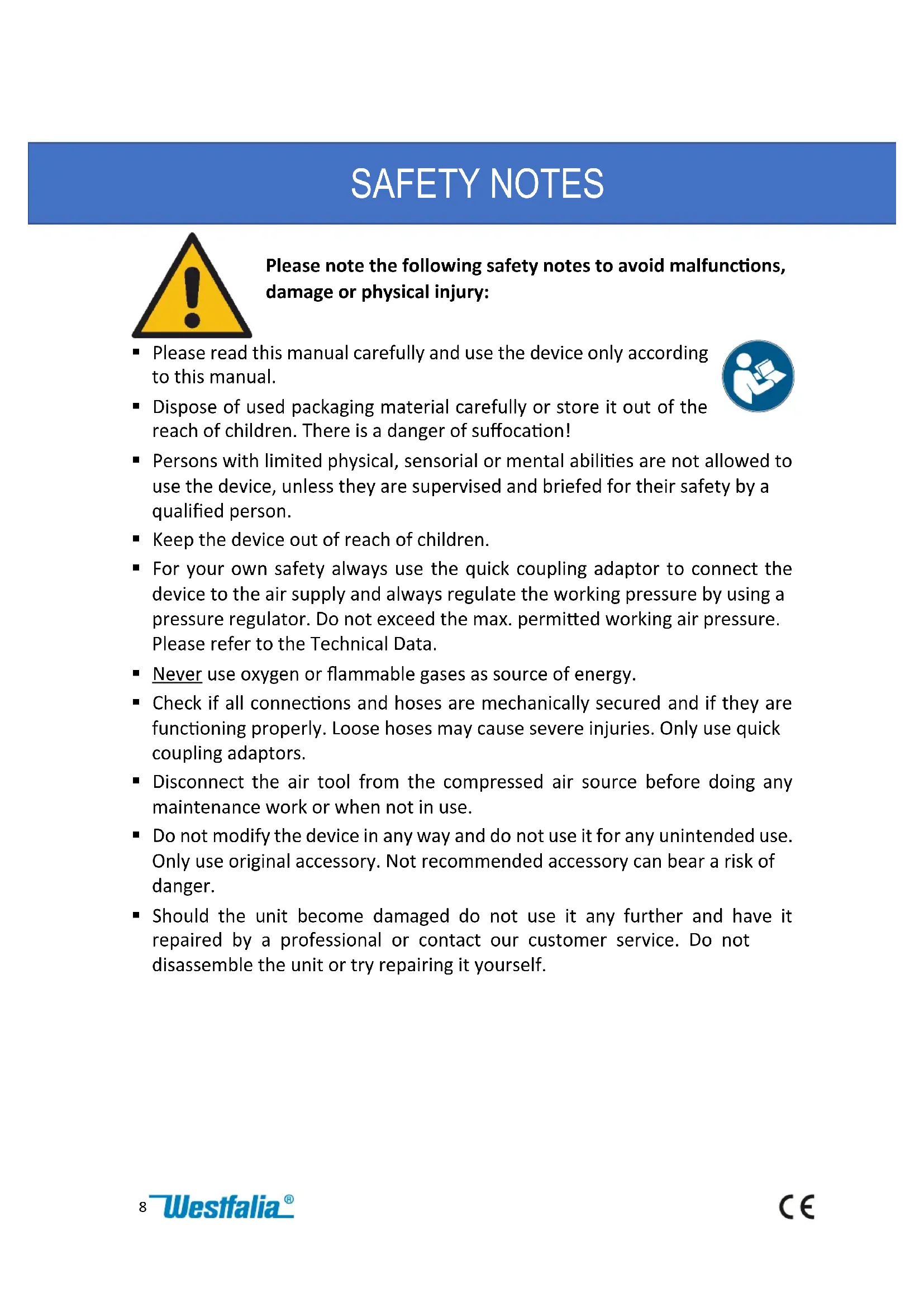 SAFETY NOTES9 Intended Use The device is designed to check the air pressure and to fill or deflate tyres, such as car, motorcycle, truck, or bicycle tyres. The intended use also includes an operation following the operating instructions. Any use beyond these parameters (different media, applying force) or any changes (reconstruction, no original accessory) can lead to serious risks and is regarded as use that is contrary to the intended purpose. Before first Use Unpack the device and check all parts for any damage in transit. Dispose of packaging materials or store them out of reach of children. There is risk of suffocation! Notes The optimum air pressure of the car tyre not only provides safe performance and durability of your tyres – using the right tyre pressure, recommended by the automobile manufacturer, also can safe fuel. You will find the details on the comfortable minimum pressure for your tyres in the instruction manual of your vehicle or e.g. at the door pillar or behind the petrol cap. The compressed air, to refill the tyre, has to be oil free. Do not connect an oiler ahead of the unit. It is recommended to use a separate compressed air hose only for working with the device, because there may be oil residues on other compressed air hoses. Measuring
