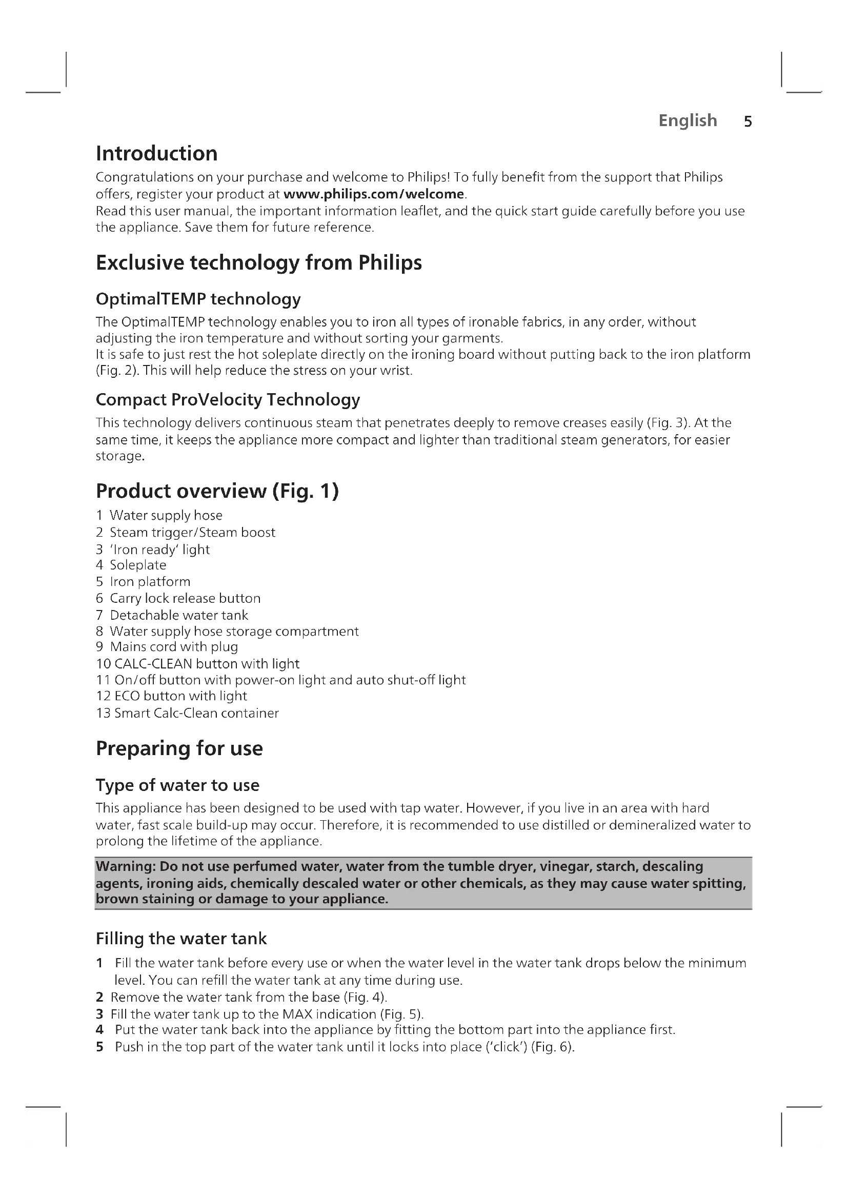 Introduction Congratulations on your purchase and welcome to Philips! To fully benet from the support that Philips oers, register your product at www.philips.com/welcome. Read this user manual, the important information leaet, and the quick start guide carefully before you use the appliance. Save them for future reference. Exclusive technology from Philips OptimalTEMP technology The OptimalTEMP technology enables you to iron all types of ironable fabrics, in any order, without adjusting the iron temperature and without sorting your garments. It is safe to just rest the hot soleplate directly on the ironing board without putting back to the iron platform (Fig. 2). This will help reduce the stress on your wrist. Compact ProVelocity Technology This technology delivers continuous steam that penetrates deeply to remove creases easily (Fig. 3). Atthe same time, it keeps the appliance more compact and lighter than traditional steam generators, for easier storage. Product overview (Fig. 1) 1 Water supply hose 2 Steam trigger/Steam boost 3 ‘Iron ready’ light 4 Soleplate 5 Iron platform 6 Carry lock release button 7 Detachable water tank 8 Water supply hose storage compartment 9 Mains cord with plug 10 CALC-CLEAN button with light 11 On/o button with power-on light and auto shut-o light 12 ECO button with light 13 Smart Calc-Clean container Preparing for use Type of water to use This appliance has been designed to be used with tap water. However, if you live in an area with hard water, fast scale build-up may occur. Therefore, it is recommended to use distilled or demineralized water to prolong the lifetime of the appliance.