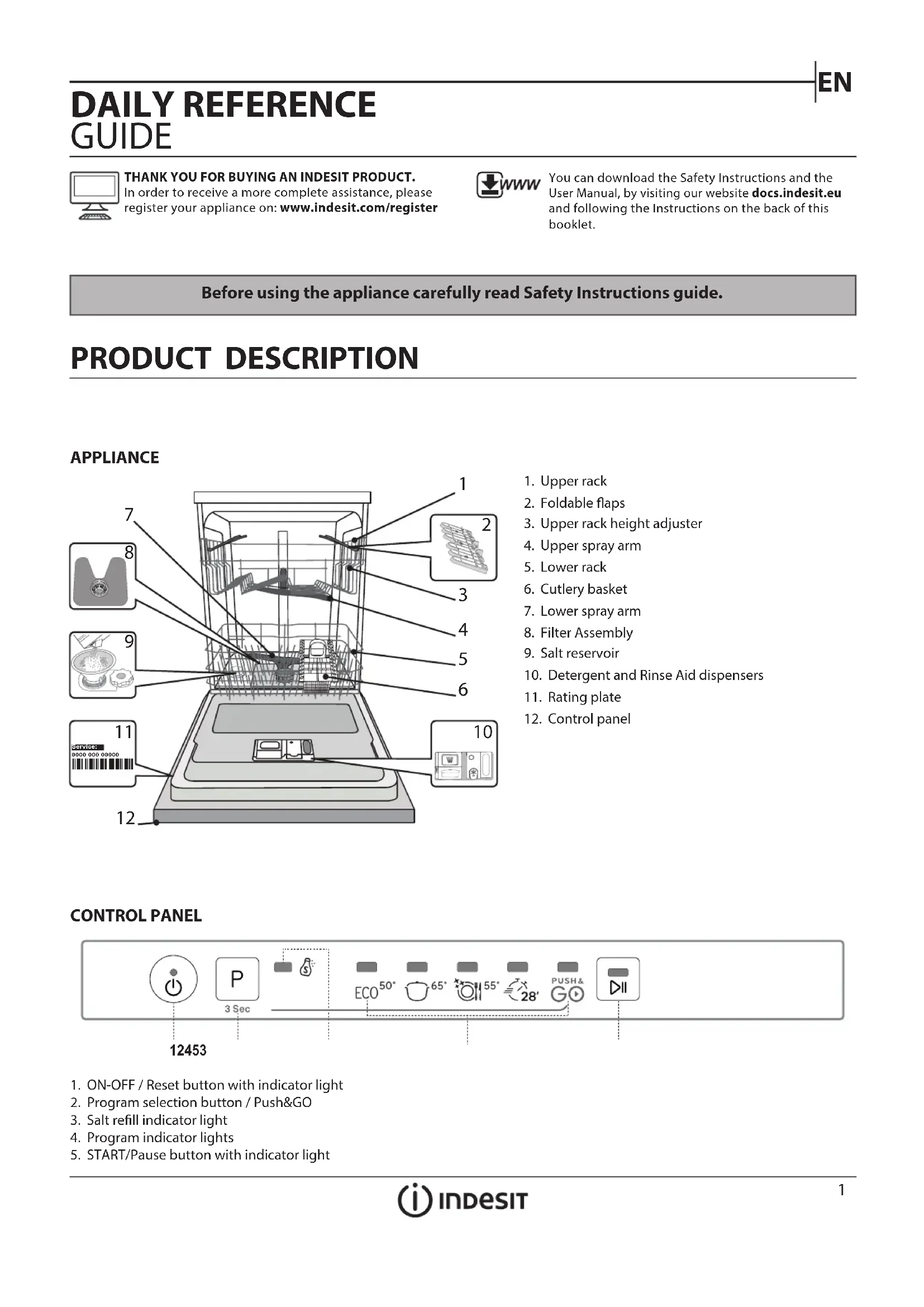 Before using the appliance carefully read Safety Instructions guide. APPLIANCE THANK YOU FOR BUYING AN INDESIT PRODUCT. In order to receive a more complete assistance, please register your appliance on: www.indesit.com/registerYou can download the Safety Instructions and the User Manual, by visiting our website docs.indesit.eu and following the Instructions on the back of this booklet.1. Upper rack2. Foldable aps3. Upper rack height adjuster4. Upper spray arm5. Lower rack6. Cutlery basket7. Lower spray arm8. Filter Assembly9. Salt reservoir10. Detergent and Rinse Aid dispensers11. Rating plate12. Control panel1 2 4 531. ON-OFF / Reset button with indicator light2. Program selection button / Push&GO3. Salt rell indicator light4. Program indicator lights5. START/Pause button with indicator light DAILY REFERENCE GUIDE CONTROL PANEL 0000 000 00000 Service: