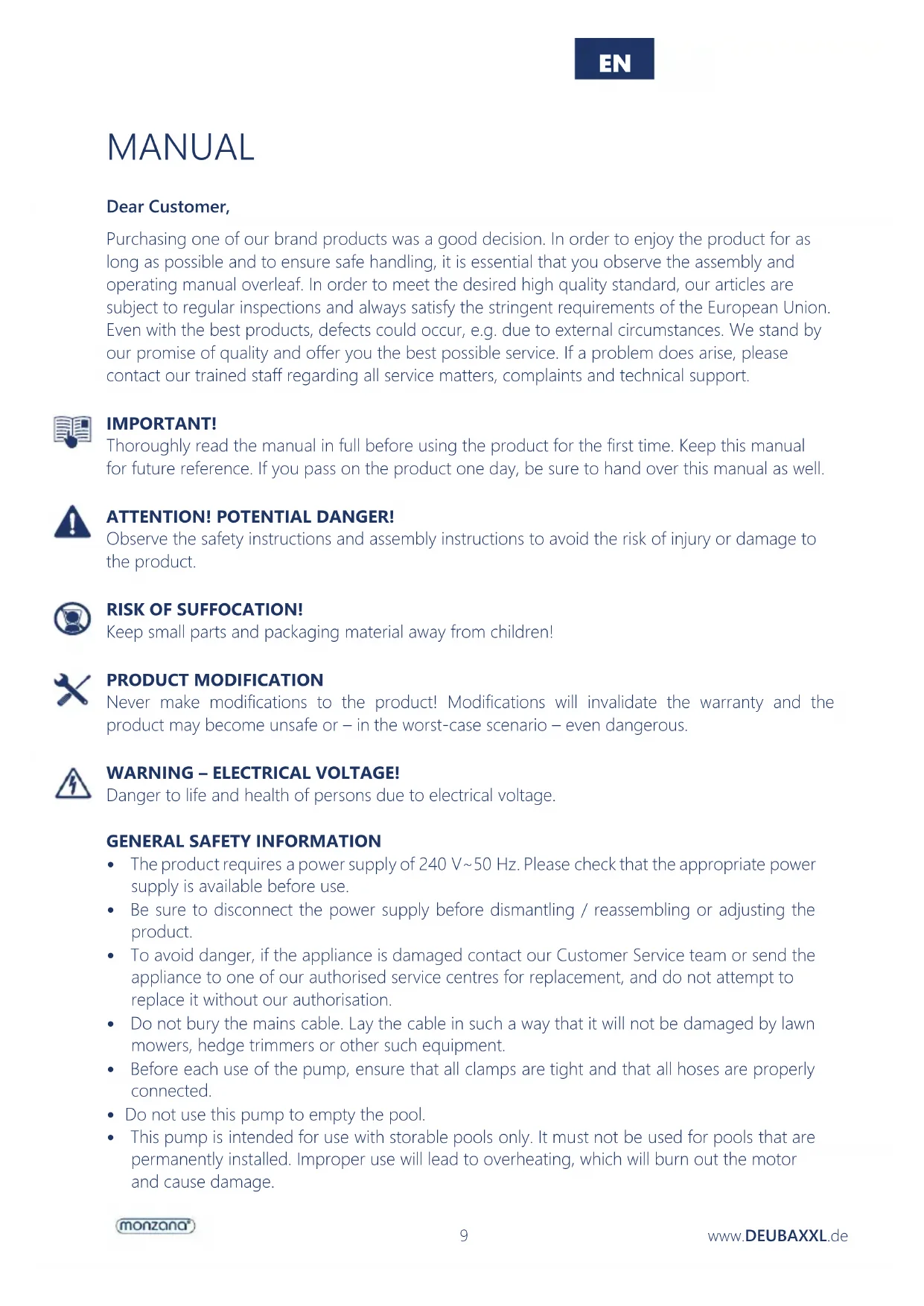 - This pump is intended for use with storable pools only. It must not be used for pools that are permanently installed. Improper use will lead to overheating, which will burn out the motor and cause damage. MANUAL EN10 www.DEUBAXXL.de