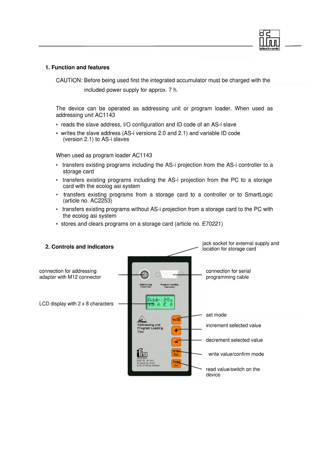 Download the instructions for your Memory reader in PDF format for free! Find your manual AC1143 - IFM and take your electronic device back in hand. On this page are published all the documents necessary for the use of your device. AC1143 by IFM.