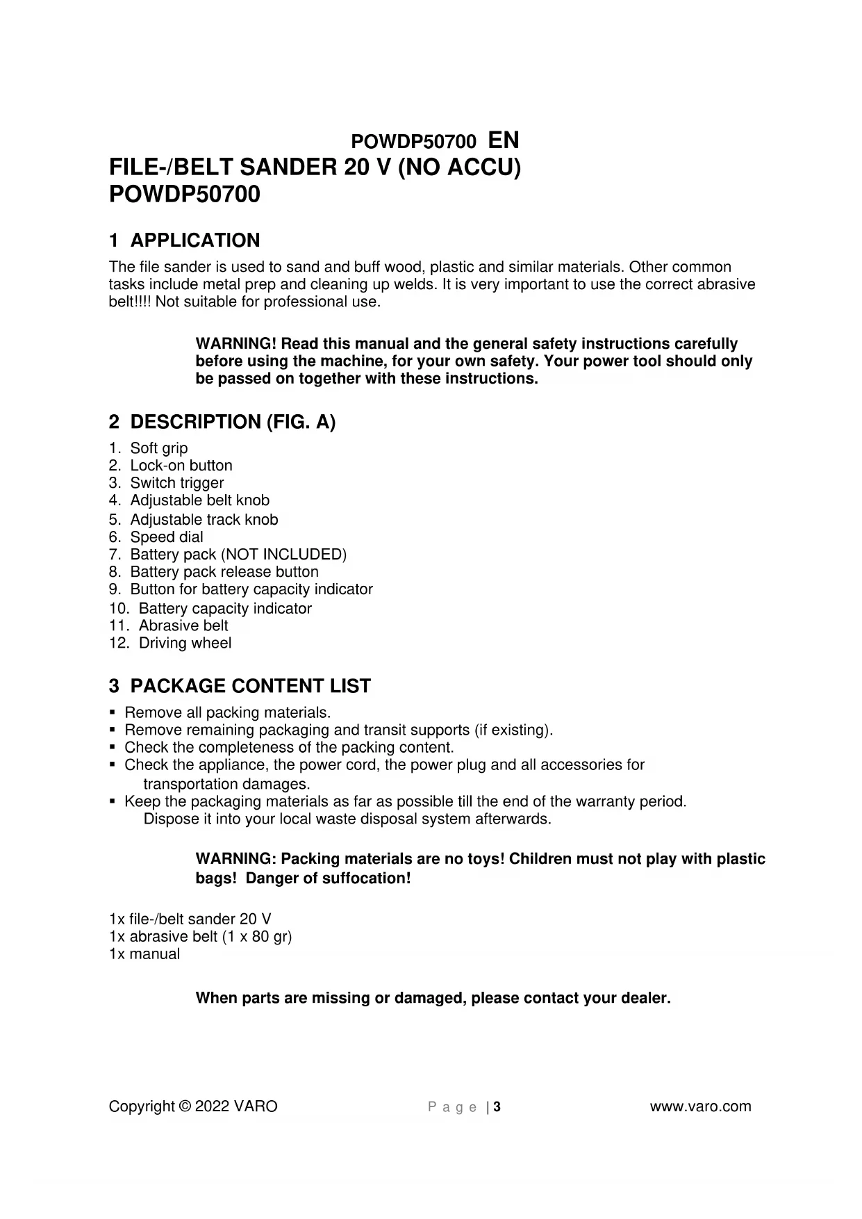 Copyright © 2022 VARO P a g e | 3 www.varo.com FILE-/BELT SANDER 20 V (NO ACCU) POWDP50700 1 APPLICATION The file sander is used to sand and buff wood, plastic and similar materials. Other common tasks include metal prep and cleaning up welds. It is very important to use the correct abrasive belt!!!! Not suitable for professional use. WARNING! Read this manual and the general safety instructions carefully before using the machine, for your own safety. Your power tool should only be passed on together with these instructions. 2 DESCRIPTION (FIG. A)