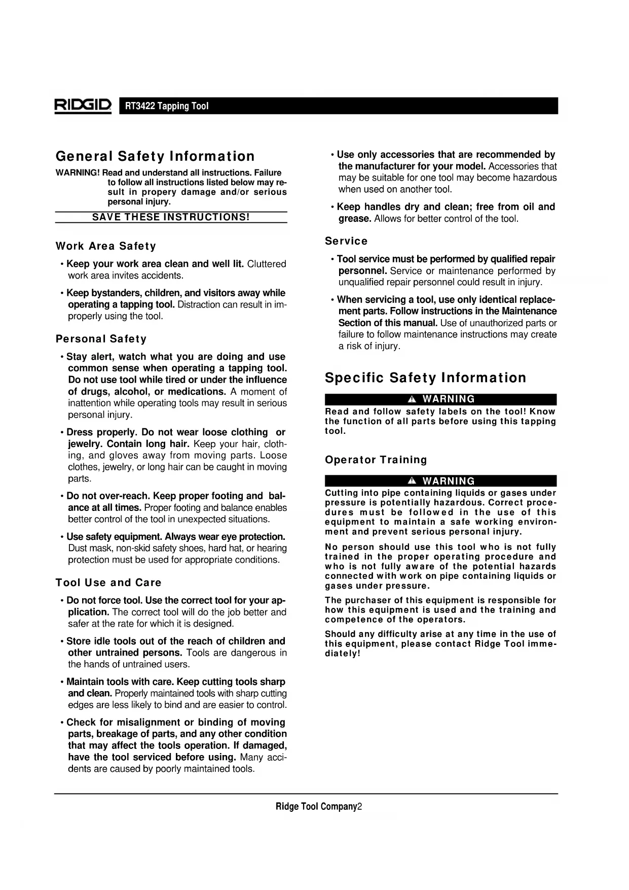 - When servicing a tool, use only identical replace- ment parts. Follow instructions in the Maintenance Section of this manual. Use of unauthorized parts or failure to follow maintenance instructions may create a risk of injury. Specific Safety Information WARNING Read and follow safety labels on the tool! Know the function of all parts before using this tapping tool. Operator Training WARNING Cutting into pipe containing liquids or gases under pressure is potentially hazardous. Correct proce- dures must be followed in the use of this equipment to maintain a safe working environ- ment and prevent serious personal injury. No person should use this tool who is not fully trained in the proper operating procedure and who is not fully aware of the potential hazards connected with work on pipe containing liquids or gases under pressure. The purchaser of this equipment is responsible for how this equipment is used and the training and competence of the operators. Should any difficulty arise at any time in the use of this equipment, please contact Ridge Tool imme- diately!WARNING