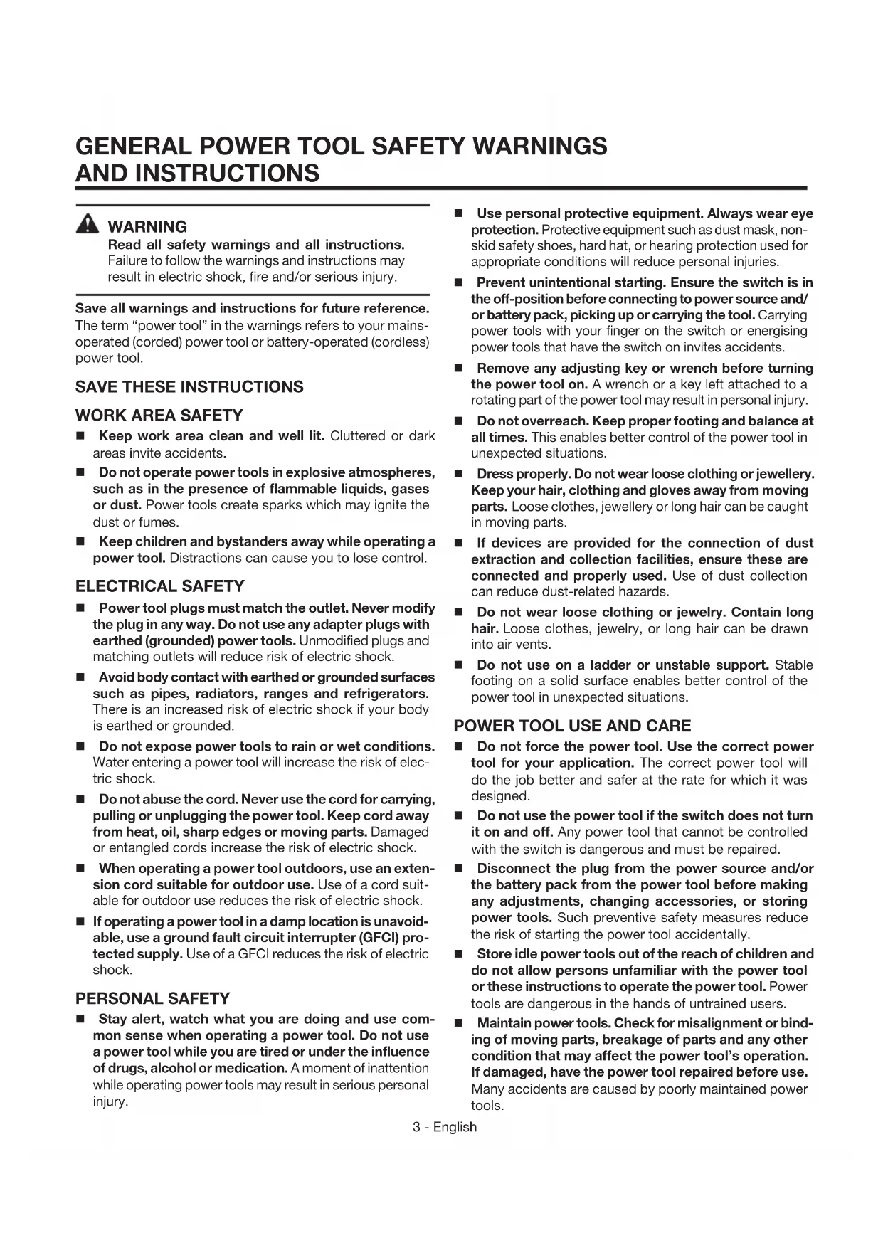Indicates a potentially hazardous situation, which, if not avoided, could result in death or serious injury. CAUTION: Indicates a potentially hazardous situation, which, if not avoided, may result in minor or moderate injury. CAUTION: (Without Safety Alert Symbol) Indicates a situation that may result in property damage.7 - English DOUBLE INSULATION Double insulation is a concept in safety in electric power tools, which eliminates the need for the usual three-wire grounded power cord. All exposed metal parts are isolated from the internal metal motor components with protecting insulation. Double insulated tools do not need to be grounded.