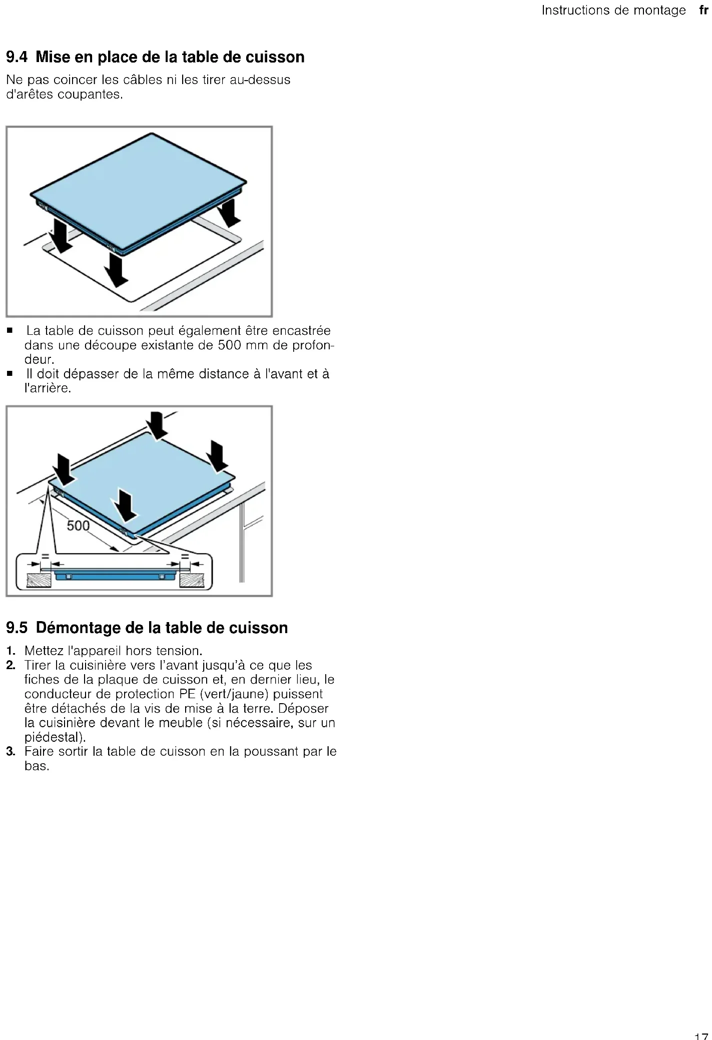 9.4 Installing the hob Ensure that the cables are not trapped or pinched, and do not route them over sharp edges. ¡ The hob can also be installed in an existing cut-out that has a depth of 500 mm. ¡ It must protrude by the same distance at the front and the rear. 9.5 Removing the hob