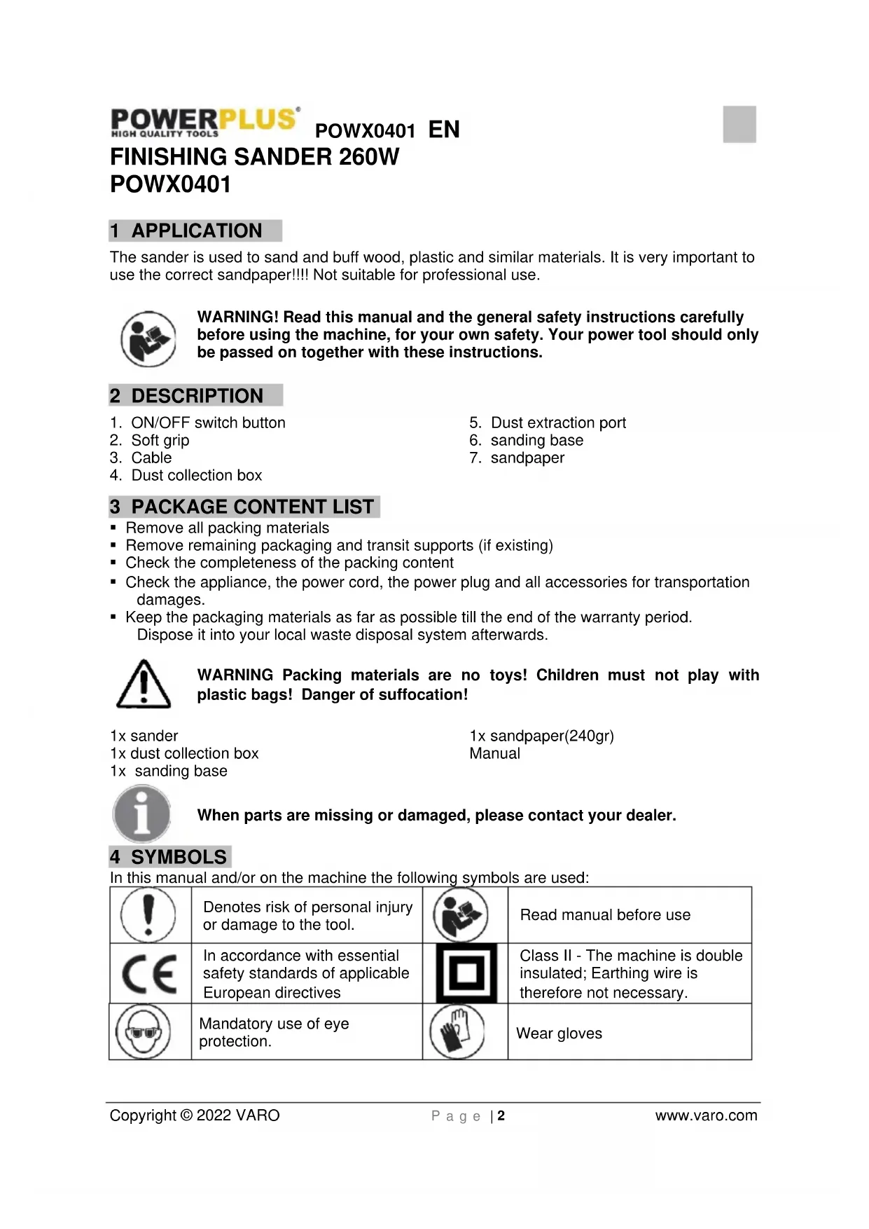 - Keep the packaging materials as far as possible till the end of the warranty period. Dispose it into your local waste disposal system afterwards. WARNING Packing materials are no toys! Children must not play with plastic bags! Danger of suffocation! 1x sander 1x dust collection box 1x sanding base 1x sandpaper(240gr) Manual When parts are missing or damaged, please contact your dealer. 4 SYMBOLS In this manual and/or on the machine the following symbols are used: