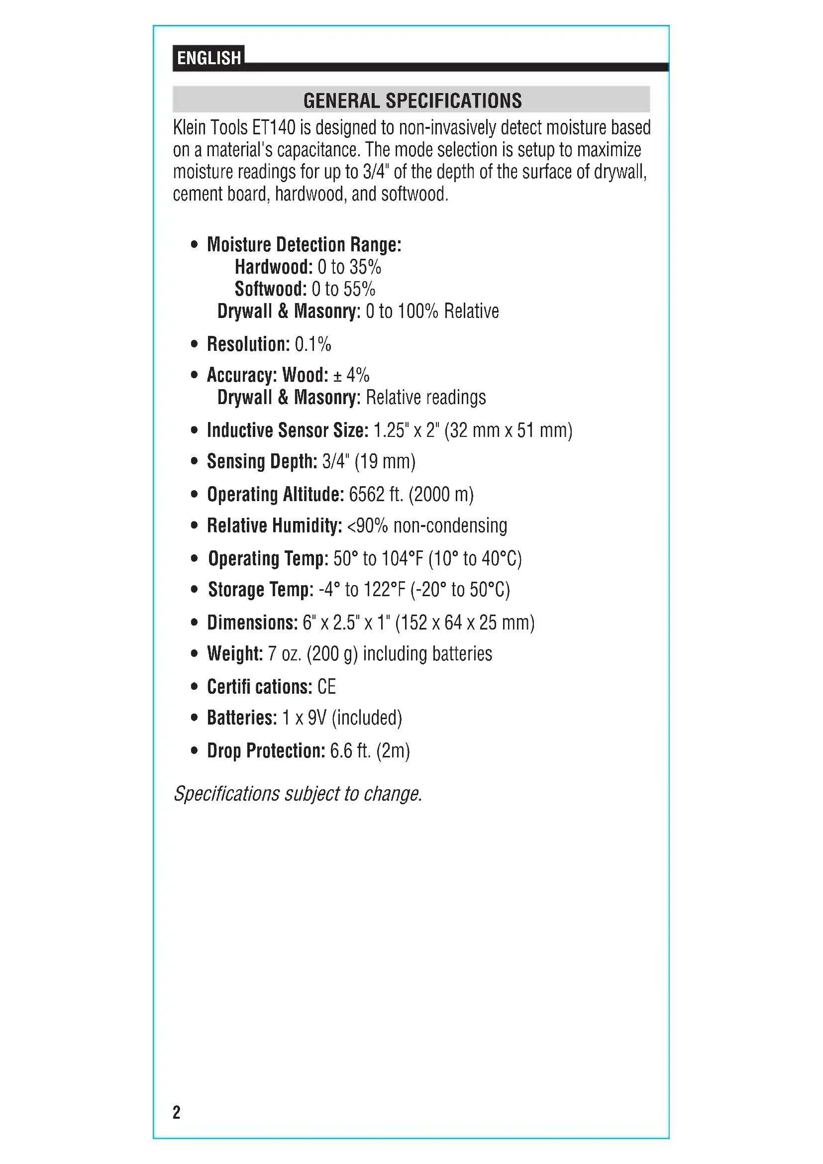 ET1402 GENERAL SPECIFICATIONS Klein Tools ET140 is designed to non-invasively detect moisture based on a material's capacitance. The mode selection is setup to maximize moisture readings for up to 3/4" of the depth of the surface of drywall, cement board, hardwood, and softwood.