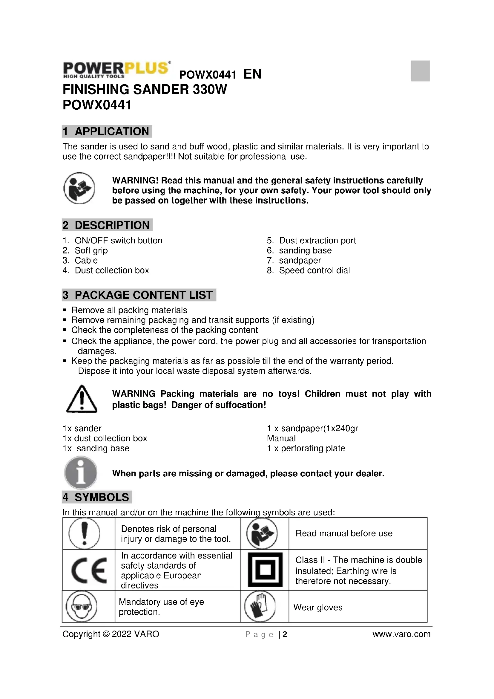 - Be sure that there are no cracks or breakage on the pad before use. Cracks or breakage may cause a personal injury. 7 OPERATING INSTRUCTIONS Before attempting to use your sander be sure to familiarize yourself with all its operating features and safety requirements. Warning! The sander should always be disconnected from the power supply when assembling parts, marking adjustments, cleaning or when the tool is not in use. Disconnecting the tool will prevent accidental starting that could cause serious injury.POWX0441 EN Copyright © 2022 VARO P a g e | 5 www.varo.com Do not sand plaster surfaces, (WARNING: In this case your guarantee becomes void) this may clog the motor (brushes, ball bearings, ..).