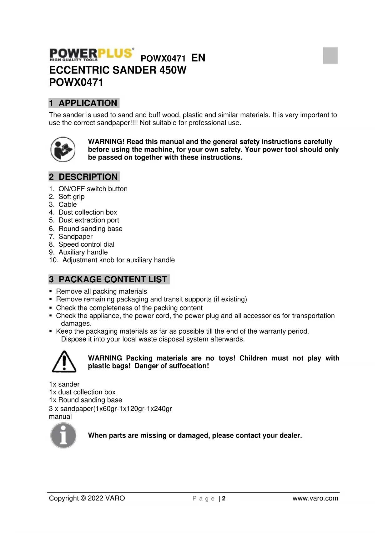 - Keep the packaging materials as far as possible till the end of the warranty period. Dispose it into your local waste disposal system afterwards. WARNING Packing materials are no toys! Children must not play with plastic bags! Danger of suffocation! 1x sander 1x dust collection box 1x Round sanding base 3 x sandpaper(1x60gr-1x120gr-1x240gr manual When parts are missing or damaged, please contact your dealer.POWX0471 EN Copyright © 2022 VARO P a g e | 3 www.varo.com 4 SYMBOLS In this manual and/or on the machine the following symbols are used: