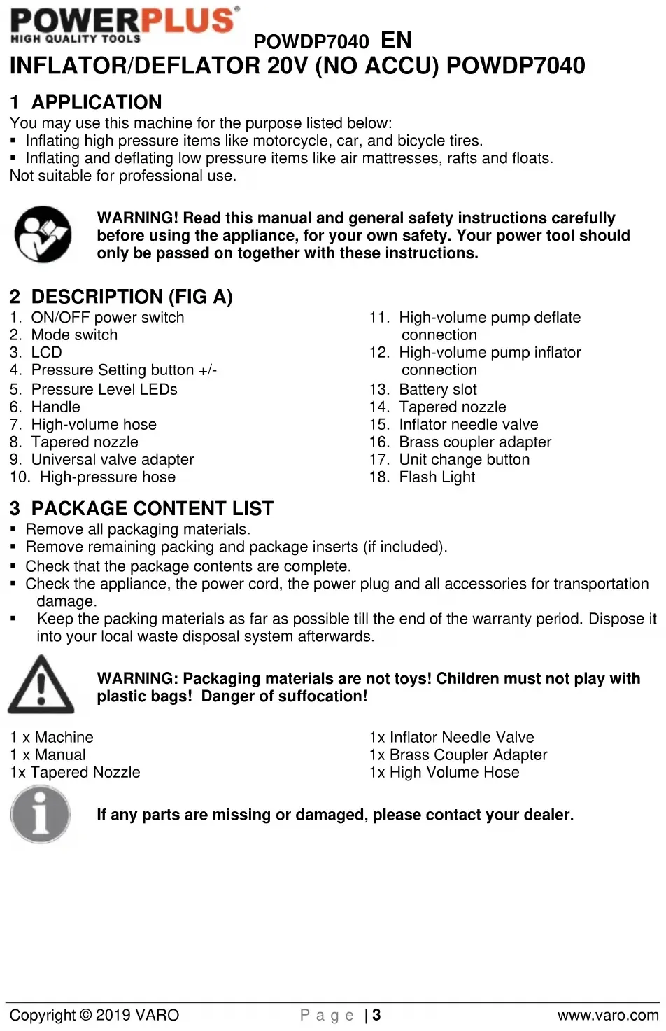 VARO N.V. - Joseph Van Instraat 9 - BE2500 Lier - BELGIUM, declares that, Product: INFLATOR/DEFLATOR 20V Trade mark: POWERplus Model: POWDP7040 is in conformity with the essential requirements and other relevant provisions of the applicable European Directives, based on the application of European harmonized standards. Any unauthorized modification of the apparatus voids this declaration. European Directives (including, if applicable, their amendments up to the date of signature); 2011/65/EU 2014/30/EU 2006/42/EC European harmonized standards (including, if applicable, their amendments up to the date of signature); EN 60204-1:2006 EN 1012-1:2010 EN 60335-1:2012 EN55014-1 : 2017 EN55014-2 : 2015 EN61000-3-2 : 2014 EN61000-3-3 : 2013 Keeper of the Technical Documentation : Philippe Vankerkhove, VARO – Vic. Van Rompuy N.V. The undersigned acts on behalf of the company CEO, Hugo Cuypers Certification Manager Lier, 04/01/2019POWDP7040 DE Copyright © 2019 VARO Seite | 1 www.varo.com 1 EINSATZBEREICH ......................................................................... 3