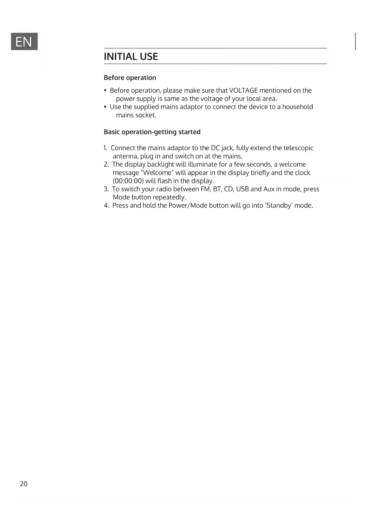 - Use the supplied mains adaptor to connect the device to a household mains socket. Basic operation-getting started