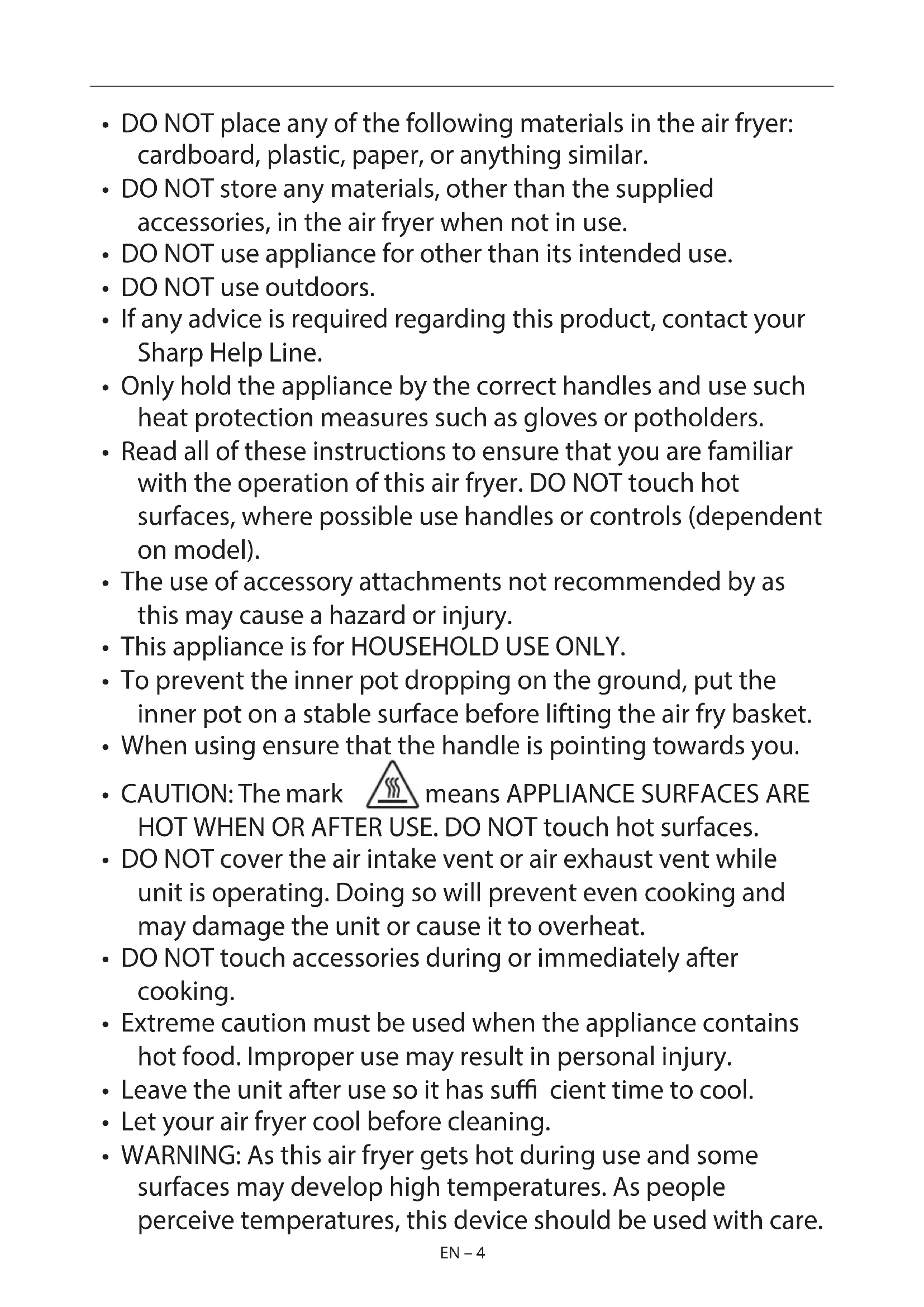 - WARNING: As this air fryer gets hot during use and some surfaces may develop high temperatures. As people perceive temperatures, this device should be used with care.EN EN – 4EN – 4