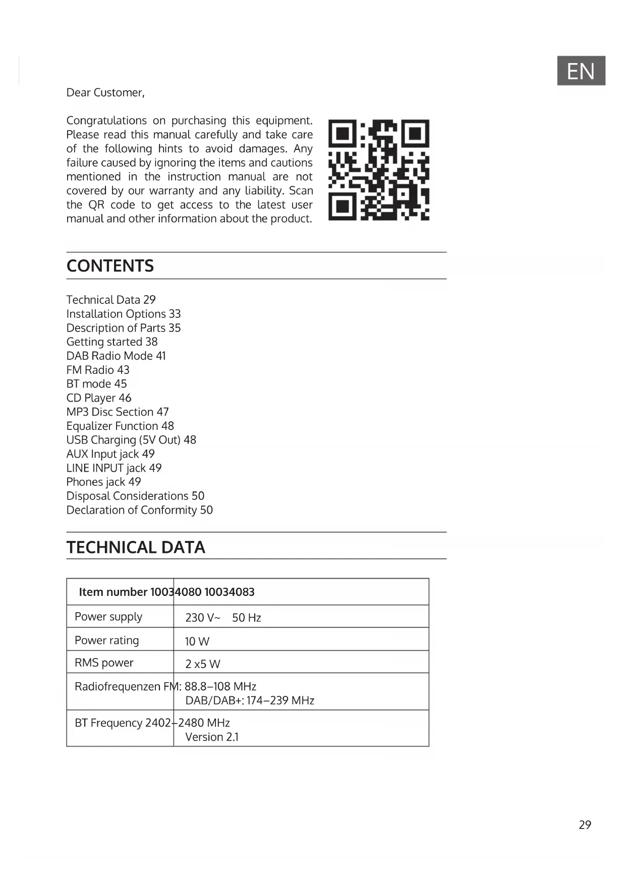 CONTENTS Technical Data 29 Installation Options 33 Description of Parts 35 Getting started 38 DAB Radio Mode 41 FM Radio 43 BT mode 45 CD Player 46 MP3 Disc Section 47 Equalizer Function 48 USB Charging (5V Out) 48 AUX Input jack 49 LINE INPUT jack 49 Phones jack 49 Disposal Considerations 50 Declaration of Conformity 50 TECHNICAL DATA Item number 10034080 10034083 Power supply 230 V~ 50 Hz Power rating 10 W RMS power 2 x5 W Radiofrequenzen FM: 88.8–108 MHz DAB/DAB+: 174–239 MHz BT Frequency 2402–2480 MHz Version 2.1 Dear Customer, Congratulations on purchasing this equipment. Please read this manual carefully and take care of the following hints to avoid damages. Any failure caused by ignoring the items and cautions mentioned in the instruction manual are not covered by our warranty and any liability. Scan the QR code to get access to the latest user manual and other information about the product.30