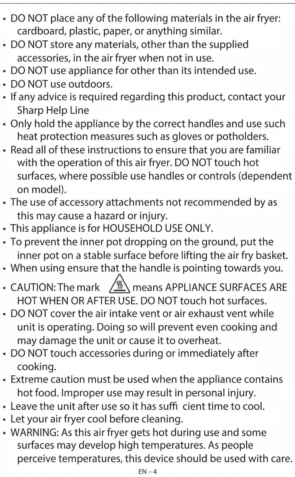 CAUTION: DO NOT USE ABRASIVE CLEANERS OR ANY TYPE OF SCOURING MATERIAL on the surface of the frying basket and inner pot. Make sure to only use mild, soapy water. Abrasive cleaners, scrubbing brushes and chemical cleaners will damage the coating on this unit. Other than the recommended cleaning, no further user maintenance should be necessary. Any other servicing should be performed by an authorized service representative. STORAGE Unplug unit, allow it to cool, and clean before storing. Store the air fryer in its box in a clean, dry place. Never store appliance while it is hot or still plugged in. Never wrap cord tightly around the Air Fryer. Do not put any stress on the cord where it enters the unit, as it could cause the cord to fray and break. If storing the air fryer for long periods of time, make certain that the air fryer is clean and free of food particles. Store the air fryer in a dry location such as on a table or countertop or cupboard shelf.EN – 14 EN – 14 TROUBLESHOOTING If you are experiencing issues with your air fryer, follow the guidance below. The Air Fryer does not work The appliance is either not plugged in or switched on. Make sure the mains plug is inserted in an electrical wall socket and is switched on. You have not set the time or tempertaure. Set the time and temperature and then press "START/CANCEL". The inner pot is not properly locked into the unit Push the inner pot into the Air Fryer so it "clicks". The ingredients fried with the Air Fryer are not done. There is too much food in the frying basket. Put smaller batches of ingredients in the frying basket. Smaller batches are fried more evenly. The set temperature is too low. Adjust the temperature to the required temperature setting. The cooking time is too short. Adjust the timer to the required preparation time. Fried snacks are not crispy when they come out of the Air Fryer. You used a type of snack meant to be prepared in a traditional deep fryer. Use snacks made to be prepared in the oven, or lightly brush some oil onto the snacks for a crispier result. It is di cult or not possible to slide the inner pot and frying basket into the appliance properly. There is too much food in the frying basket. Do not over ll the frying basket. The frying basket in not placed properly into the inner pot Push the frying basket down into the inner pot until you hear a slight click. White smoke comes out of the appliance. You are preparing greasy ingredients. When you fry greasy ingredients in the Air Fryer, a large amount of oil will leak into the pan. This oil may white smoke and the pan may heat up more than usual. This does not a ect the appliance or the end result. The pan still contains grease residues from previous use. White smoke is caused by grease heating up in the inner pot; make sure you clean the frying basket and inner pot thoroughly after each use. Fresh fries are fried unevenly in the Air Fryer. You did not use the right type of potato. Use fresh potatoes and make sure they stay rm during frying. You did not rinse the potato sticks properly before you fried them. Rinse the potato sticks thoroughly to remove starch from the outside of the sticks. Fresh fries are not crispy when they come out of the Air Fryer. The crispiness of the fries depends on the amount/ type of oil and water in the fries. Make sure you dry the potato sticks properly before you add the oil. Cut the potatoes into thinner sticks for a crispier result. Add slightly more oil for a crispier result. Should you still have issues, please contact the SHARP Call Centre using the details at the start of this User Manual.BG EN – 14EN – 14 TROUBLESHOOTING If you are experiencing issues with your air fryer, follow the guidance below. The Air Fryer does not work The appliance is either not plugged in or switched on. Make sure the mains plug is inserted in an electrical wall socket and is switched on. You have not set the time or tempertaure. Set the time and temperature and then press "START/CANCEL". The inner pot is not properly locked into the unit Push the inner pot into the Air Fryer so it "clicks". The ingredients fried with the Air Fryer are not done. There is too much food in the frying basket. Put smaller batches of ingredients in the frying basket. Smaller batches are fried more evenly. The set temperature is too low. Adjust the temperature to the required temperature setting. The cooking time is too short. Adjust the timer to the required preparation time. Fried snacks are not crispy when they come out of the Air Fryer. You used a type of snack meant to be prepared in a traditional deep fryer. Use snacks made to be prepared in the oven, or lightly brush some oil onto the snacks for a crispier result. It is di cult or not possible to slide the inner pot and frying basket into the appliance properly. There is too much food in the frying basket. Do not over ll the frying basket. The frying basket in not placed properly into the inner pot Push the frying basket down into the inner pot until you hear a slight click. White smoke comes out of the appliance. You are preparing greasy ingredients. When you fry greasy ingredients in the Air Fryer, a large amount of oil will leak into the pan. This oil may white smoke and the pan may heat up more than usual. This does not a ect the appliance or the end result. The pan still contains grease residues from previous use. White smoke is caused by grease heating up in the inner pot; make sure you clean the frying basket and inner pot thoroughly after each use. Fresh fries are fried unevenly in the Air Fryer. You did not use the right type of potato. Use fresh potatoes and make sure they stay rm during frying. You did not rinse the potato sticks properly before you fried them. Rinse the potato sticks thoroughly to remove starch from the outside of the sticks. Fresh fries are not crispy when they come out of the Air Fryer. The crispiness of the fries depends on the amount/ type of oil and water in the f