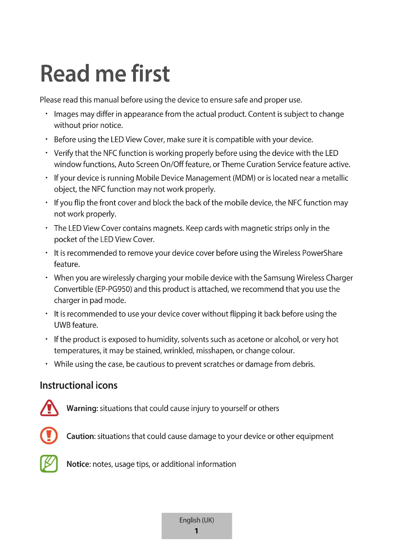 Caution: situations that could cause damage to your device or other equipment Notice: notes, usage tips, or additional information English (UK)