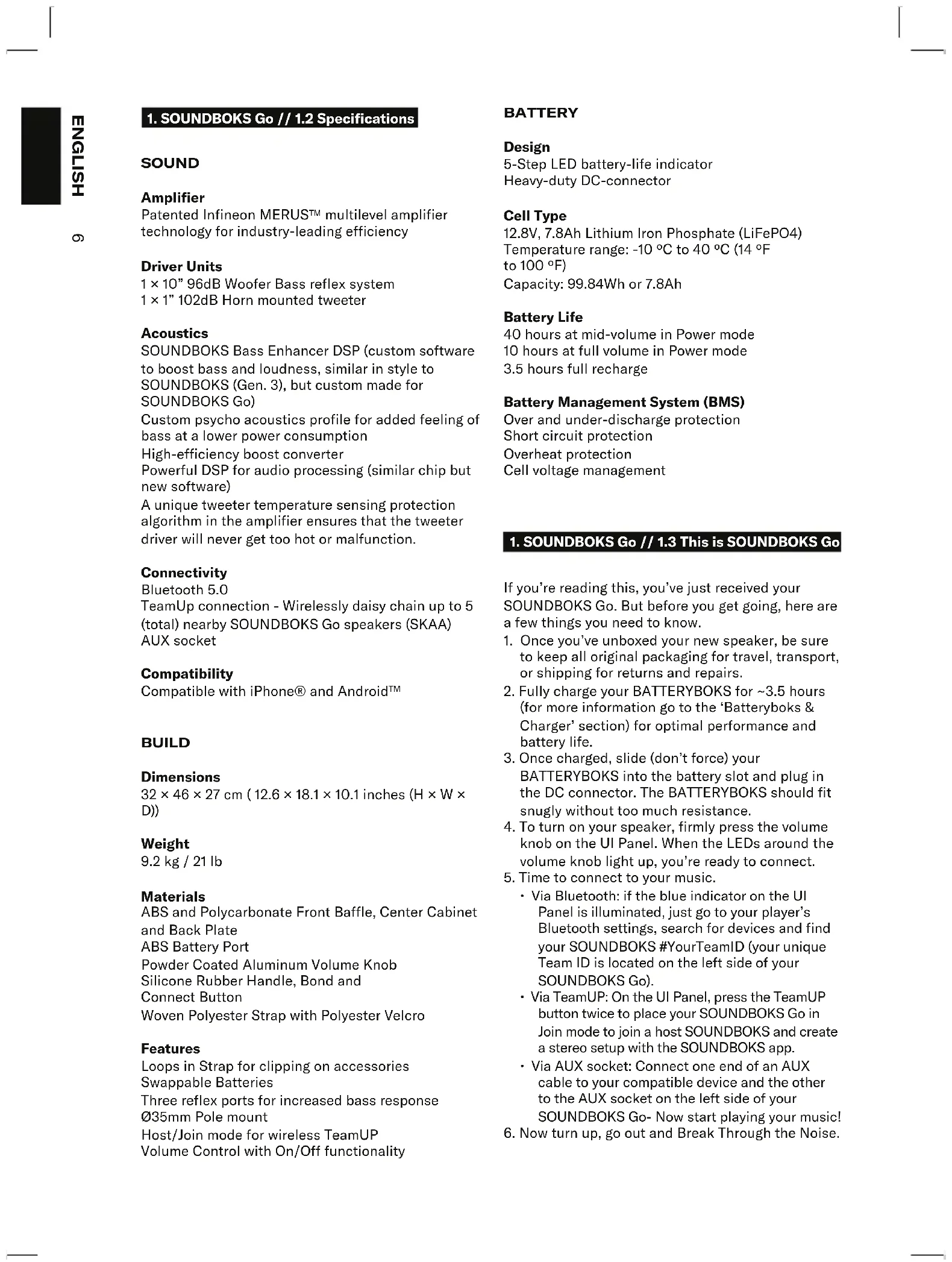 Battery Management System (BMS) Over and under-discharge protection Short circuit protection Overheat protection Cell voltage management If you’re reading this, you’ve just received your SOUNDBOKS Go. But before you get going, here are a few things you need to know.