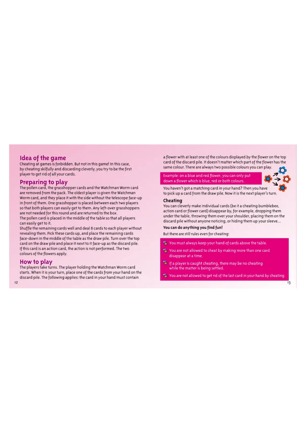 Cheating at games is forbidden. But not in this game! In this case, by cheating skilfully and discarding cleverly, you try to be the first player to get rid of all your cards. The pollen card, the grasshopper cards and the Watchman Worm card are removed from the pack. The oldest player is given the Watchman Worm card, and they place it with the side without the telescope face-up in front of them. One grasshopper is placed between each two players so that both players can easily get to them. Any left-over grasshoppers are not needed for this round and are returned to the box. The pollen card is placed in the middle of the table so that all players can easily get to it. Shuffle the remaining cards well and deal 8 cards to each player without revealing them. Pick these cards up, and place the remaining cards face-down in the middle of the table as the draw pile. Turn over the top card on the draw pile and place it next to it face-up as the discard pile. If this card is an action card, the action is not performed. The two colours of the flowers apply. The players take turns. The player holding the Watchman Worm card starts. When it is your turn, place one of the cards from your hand on the discard pile. The following applies: the card in your hand must contain a flower with at least one of the colours displayed by the flower on the top card of the discard pile. It doesn’t matter which part of the flower has the same colour. There are always two possible colours you can play. Example: on a blue and red flower, you can only put down a flower which is blue, red or both colours. You haven’t got a matching card in your hand? Then you have to pick up a card from the draw pile. Now it is the next player’s turn. Cheating You can cleverly make individual cards (be it a cheating bumblebee, action card or flower card) disappear by, for example, dropping them under the table, throwing them over your shoulder, placing them on the discard pile without anyone noticing, or hiding them up your sleeve… You can do anything you find fun! But there are still rules even for cheating: You must always keep your hand of cards above the table. You are not allowed to cheat by making more than one card disappear at a time. If a player is caught cheating, there may be no cheating while the matter is being settled. You are not allowed to get rid of the last card in your hand by cheating. Idea of the game Preparing to play How to play Example: on a blue and red flower, you can only put down a flower which is blue, red or both colours. You must always keep your hand of cards above the table. You are not allowed to cheat by making more than one card disappear at a time. If a player is caught cheating, there may be no cheating while the matter is being settled. You are not allowed to get rid of the last card in your hand by cheating.14