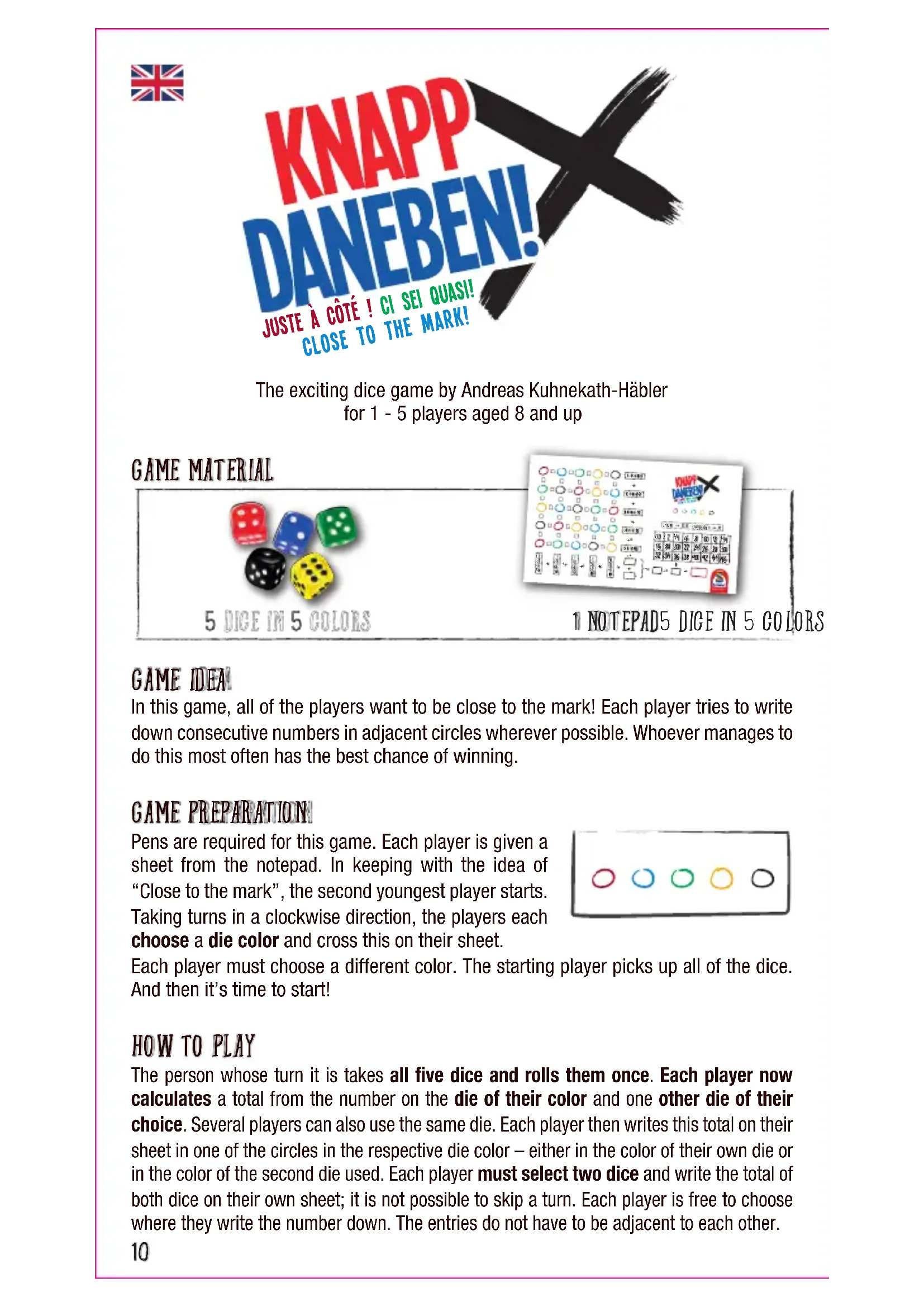CLOSE TO THE MARK! CI SEI QUASI! JUSTE À CÔTÉ !The exciting dice game by Andreas Kuhnekath-Häblerfor 1 - 5 players aged 8 and up Game Material Game Idea In this game, all of the players want to be close to the mark! Each player tries to write down consecutive numbers in adjacent circles wherever possible. Whoever manages to do this most often has the best chance of winning. Game PreParation Pens are required for this game. Each player is given a sheet from the notepad. In keeping with the idea of “Close to the mark”, the second youngest player starts. Taking turns in a clockwise direction, the players each choose a die color and cross this on their sheet. Each player must choose a different color. The starting player picks up all of the dice. And then it’s time to start! Howto play The person whose turn it is takes all five dice and rolls them once. Each player now calculates a total from the number on the die of their color and one other die of their choice. Several players can also use the same die. Each player then writes this total on their sheet in one of the circles in the respective die color – either in the color of their own die or in the color of the second die used. Each player must select two dice and write the total of both dice on their own sheet; it is not possible to skip a turn. Each player is free to choose where they write the number down. The entries do not have to be adjacent to each other.