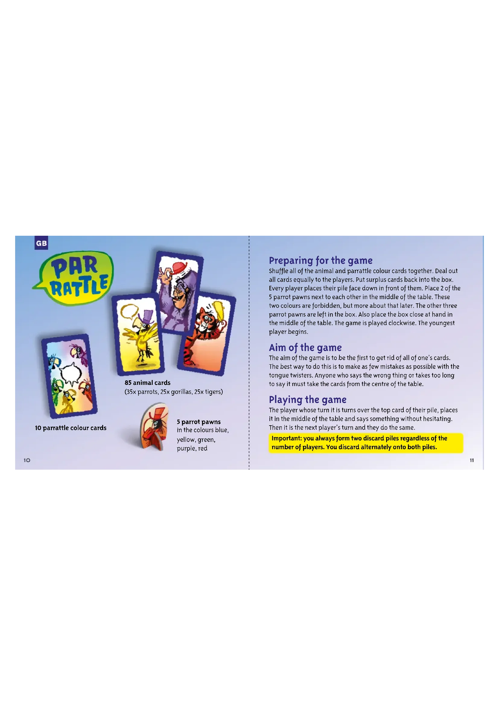 5 parrot pawns in the colours blue, yellow, green, purple, red 10 parrattle colour cards 85 animal cards (35x parrots, 25x gorillas, 25x tigers) Preparing for the game Shuffle all of the animal and parrattle colour cards together. Deal out all cards equally to the players. Put surplus cards back into the box. Every player places their pile face down in front of them. Place 2 of the 5 parrot pawns next to each other in the middle of the table. These two colours are forbidden, but more about that later. The other three parrot pawns are left in the box. Also place the box close at hand in the middle of the table. The game is played clockwise. The youngest player begins. Aim of the game The aim of the game is to be the first to get rid of all of one’s cards. The best way to do this is to make as few mistakes as possible with the tongue twisters. Anyone who says the wrong thing or takes too long to say it must take the cards from the centre of the table. Playing the game The player whose turn it is turns over the top card of their pile, places it in the middle of the table and says something without hesitating. Then it is the next player’s turn and they do the same. Important: you always form two discard piles regardless of the number of players. You discard alternately onto both piles.12